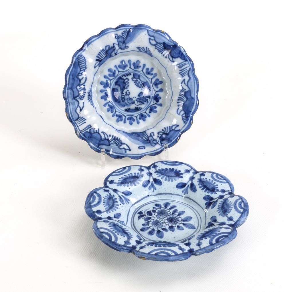 8-fach gebuckelte Schale mit Blumenmalerei (Ø 22,5 cm), Schale mit geripptem Rand und Chinoiserien (Ø 21 cm). Jeweils mit Rissen und leichten Bestoßungen.