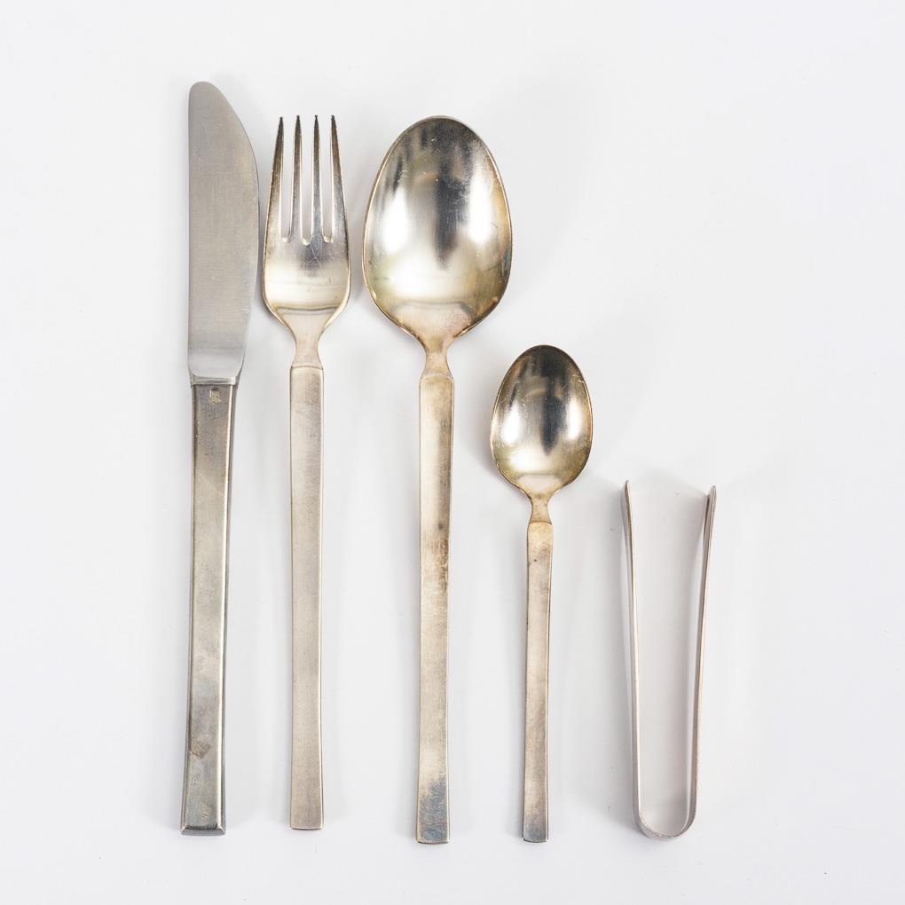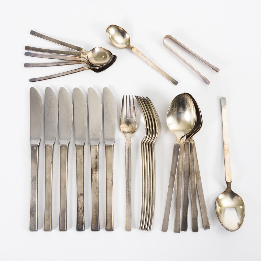 6 Messer, Gabeln, Speiselöffel und Teelöffel, 1 Zuckerzange. Elegantes Design. Gebrauchsspuren.