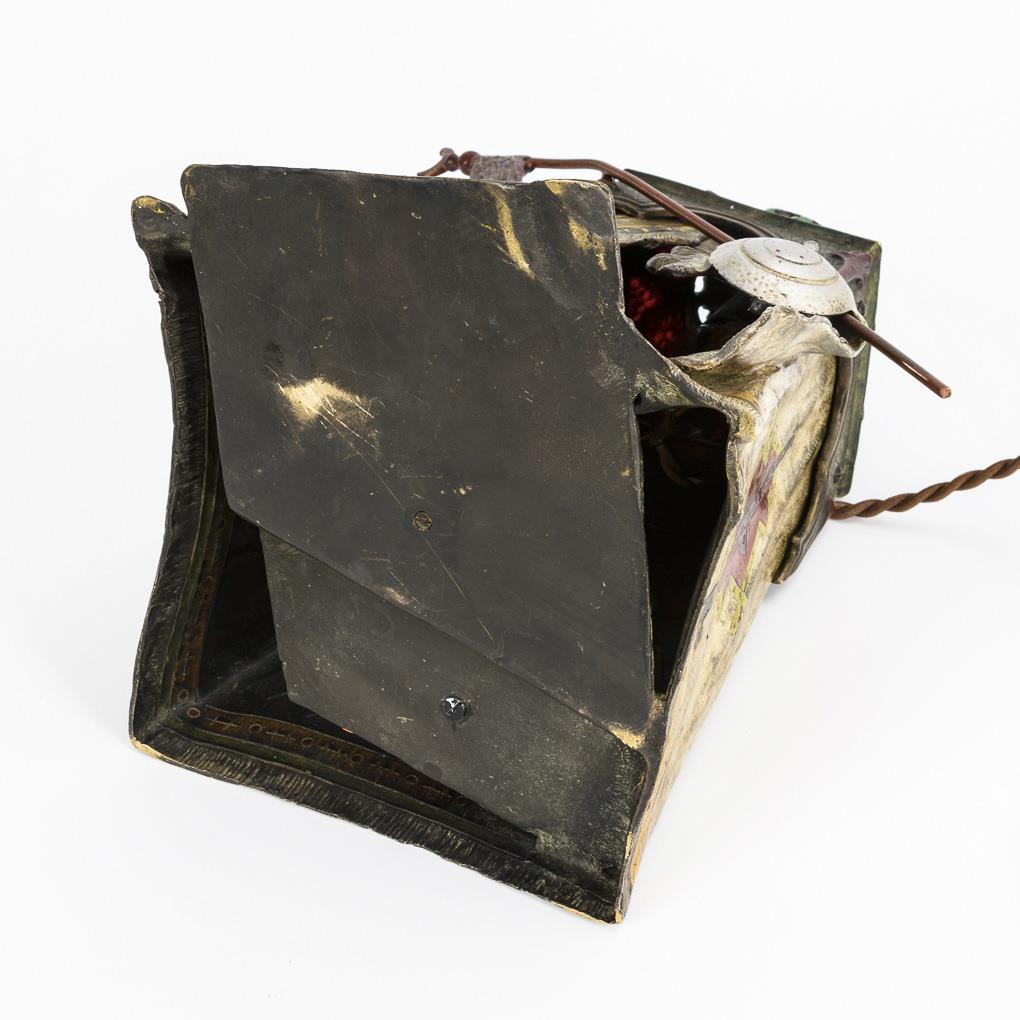Bronze polychrom gefasst, rotes Ornamentglas. Anfang 20. Jh. 32 x 19 x 23 cm (ohne Fahne).