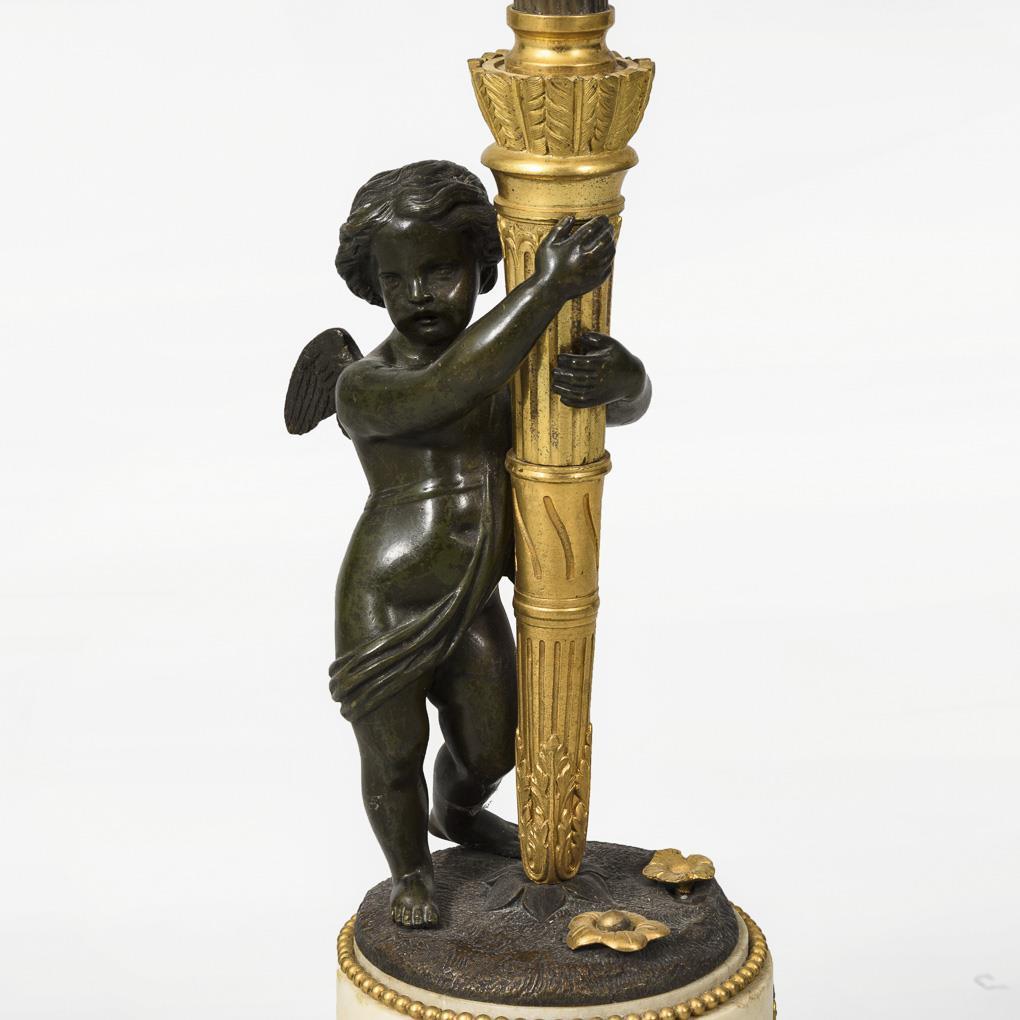 Rundes Postament mit Bronze-Appliken, vollplastische Amorfigur am Pfeilköcher, geriffelter Stabschaft, Aufsatz mit 3 Armen, Schraubfassungen in den Kunststoff-Kerzenhülsen. Dellen an der Figur, Fehlteil an der Aufsatzbefestigung, Stecker erneuert, Alters-/Gebrauchsspuren.