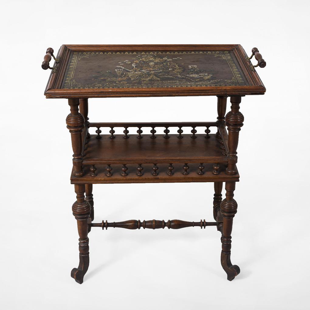 Serviertisch mit abnehmbarem Tablett, auf Drechselgestell mit Zwischenablage. Lederbezogenes Tablett mit farbiger Stilllebenmalerei und 2 seitlichen Holzgriffen. Leichte Alters- und Gebrauchsspuren, Fehlstellen an den Tablettecken.