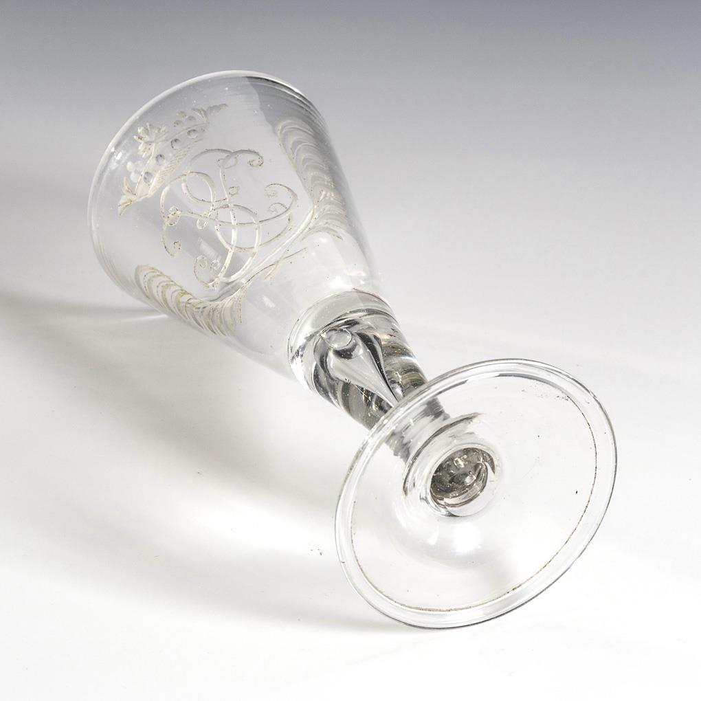 Konische, in den Hohlschaft übergehende Kuppa, Rundfuß mit umgeschlagenem Rand, Abriss. Schauseitig ein graviertes, bekröntes Monogramm.