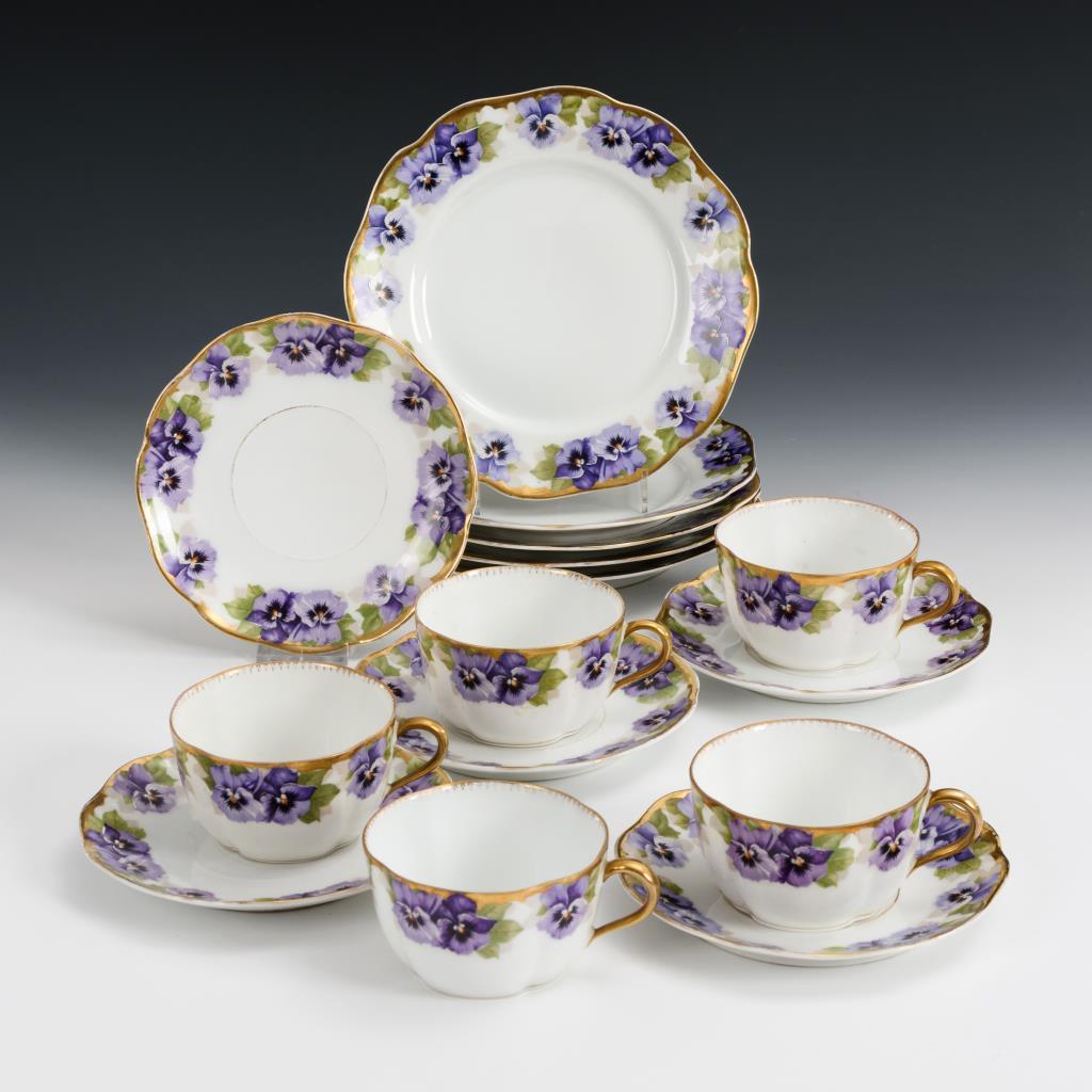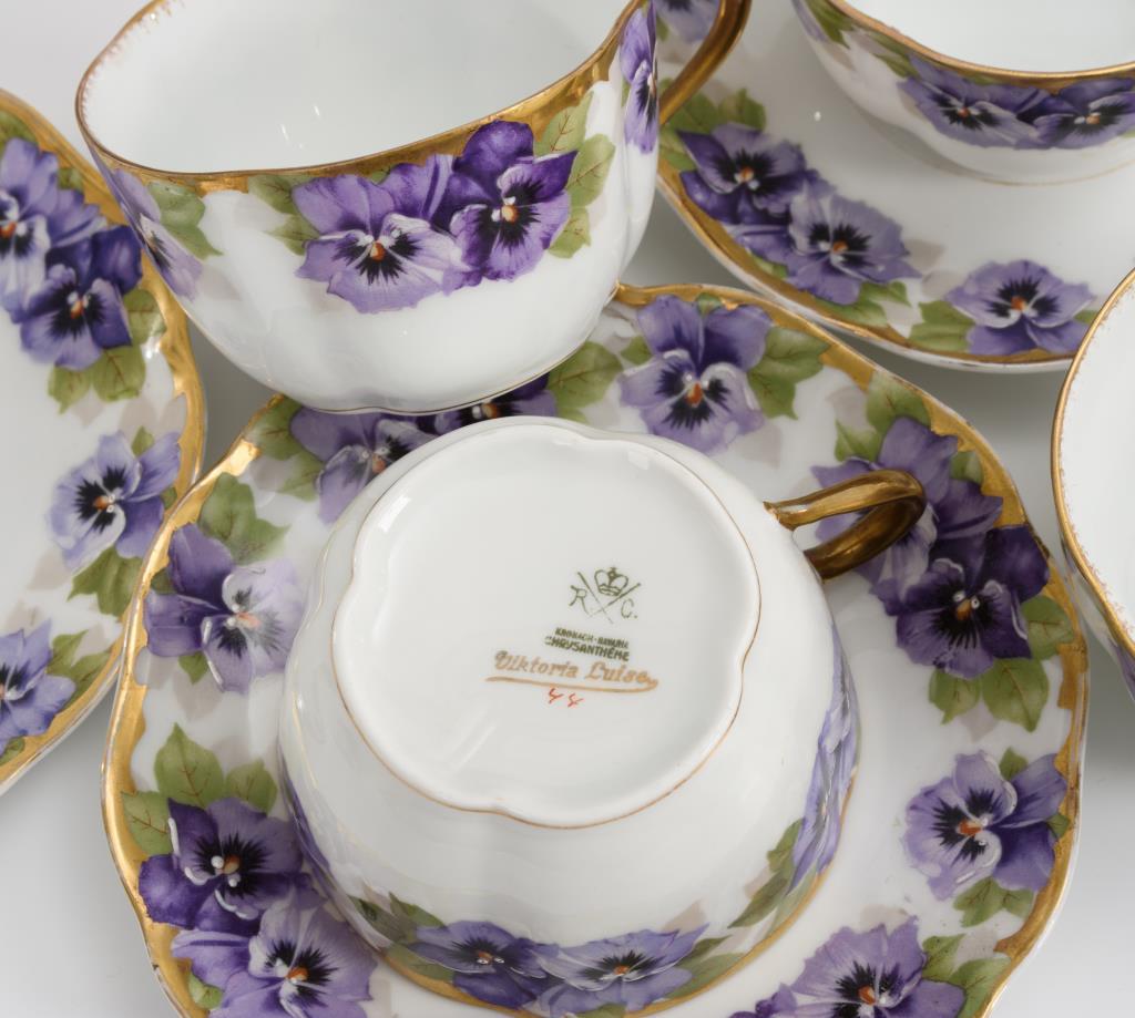 Modell "Chrysantheme", Dekor "Viktoria Luise". 5 Vierpasstassen (H 5,5 cm), 5 Untertassen (Ø 15 cm) und 5 Frühstücksteller (Ø 19,5 cm). Partieller Goldabrieb.