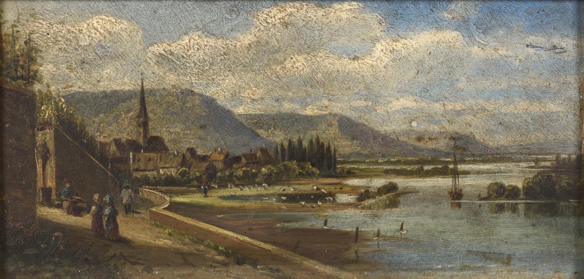 Breites Flussbett mit kleiner Ortschaft am Ufer im Sonnenschein. Altersspuren.