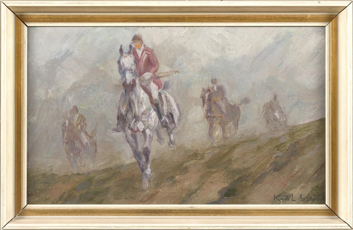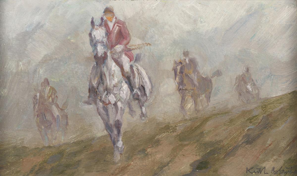 Die Reiter im Jagdkostüm im Galopp über einen Hügel.