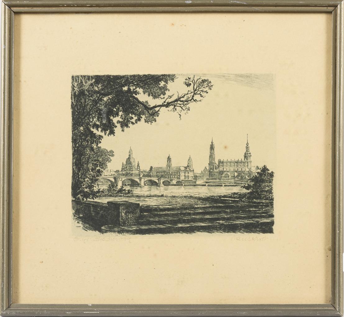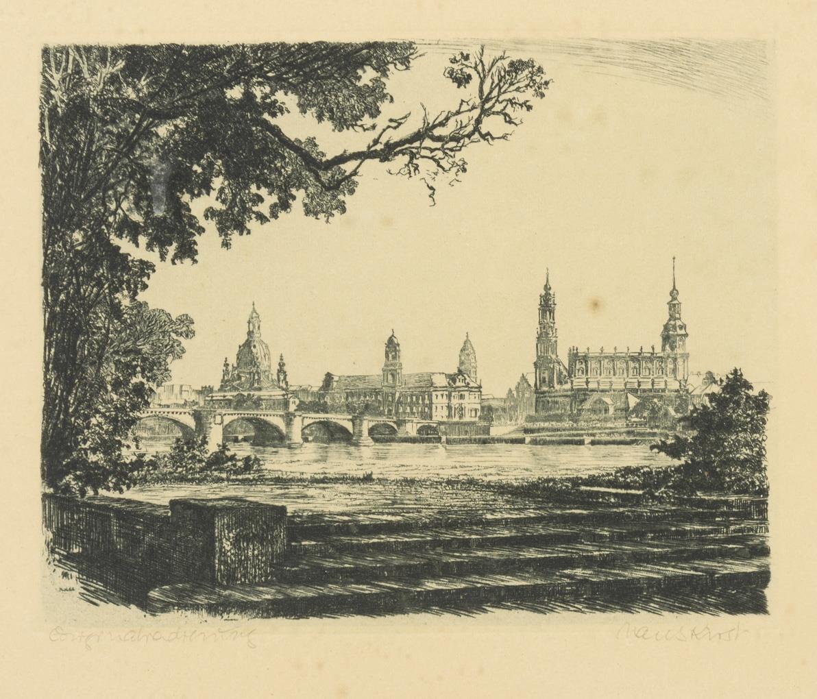 Blick über die Elbe auf die Altstadt von Dresden. Etwas stockfleckig, oberer Rand beschädigt.