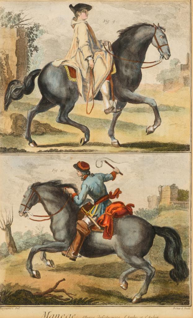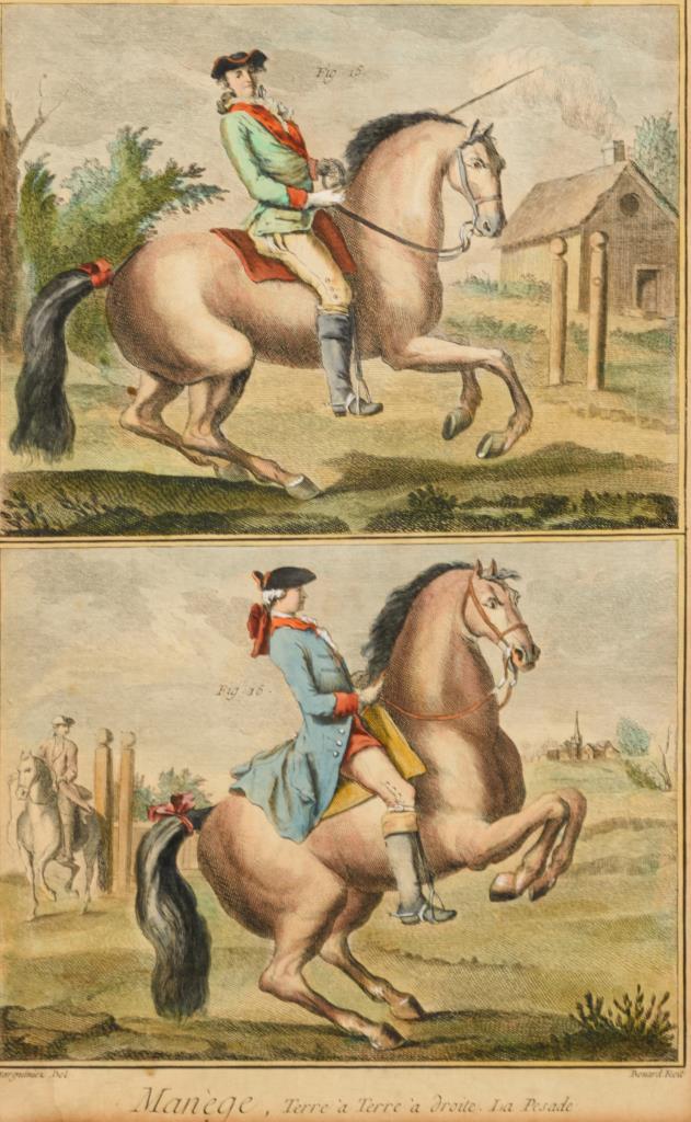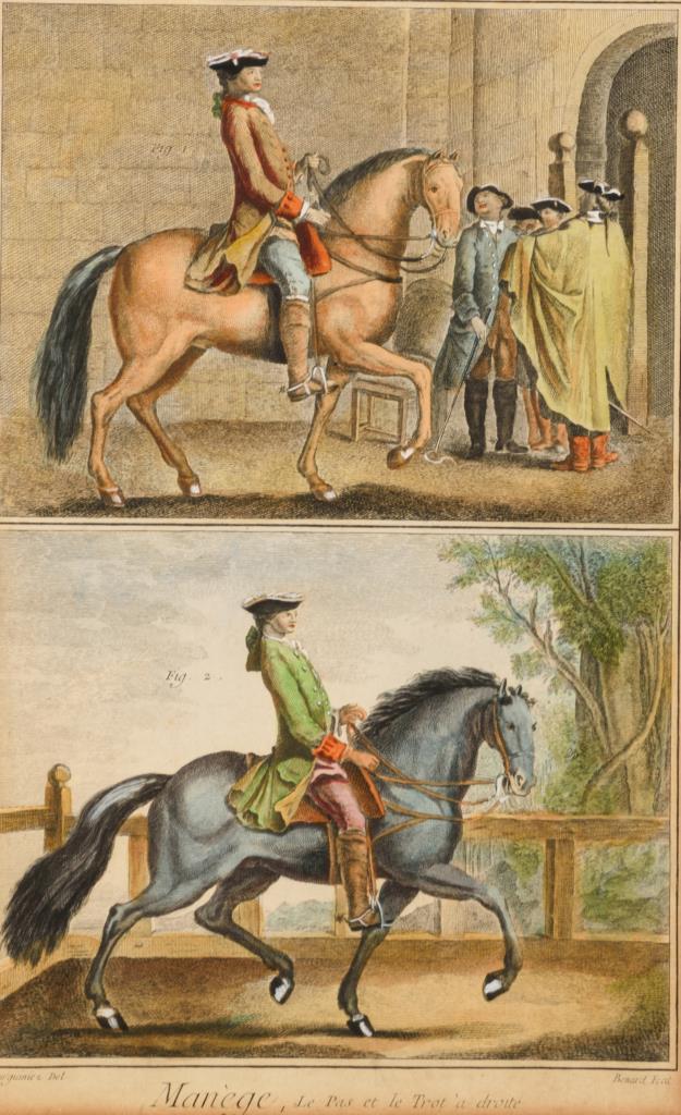 3 Ansichten aus Diderots und d´Alemberts "Encyclopédie ou Dictionnaire raisonné des sciences, des arts et des métiers [...]" (Enzyklopädie oder ein durchdachtes Wörterbuch der Wissenschaften, Künste und Handwerke) zur Reitschule: "Manège, Le Pas et le Trot à droite", "Manège, Terre à Terre à droite. La pesade" und "Manège, Allures defectures, L´Ambe et L´Aubin", gezeichnet von Harguinez, gestochen von Robert Benard. Etwas stockfleckig.
