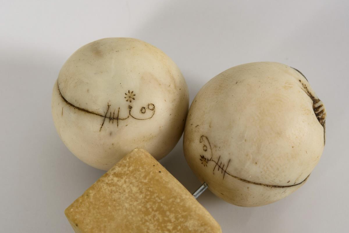 Paar Kugeln mit eingeschnitztem Liebespaar; 1x auf Sockel gesteckt. / Anhänger in Walnussform mit Christi Geburt.