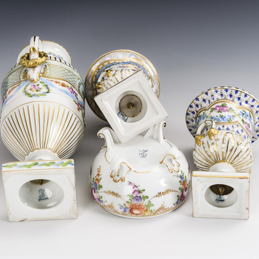 2 Krater-Deckelvasen (H 16 cm), 1 Doppelhenkelvase (H 21 cm) und 1 Dose (H 10,5 cm). Alle mit Blumenmalerei und reicher Goldmalerei. Nachtrag 25.10.21: 1 Sockelecke der großen Vase minimal bestoßen.