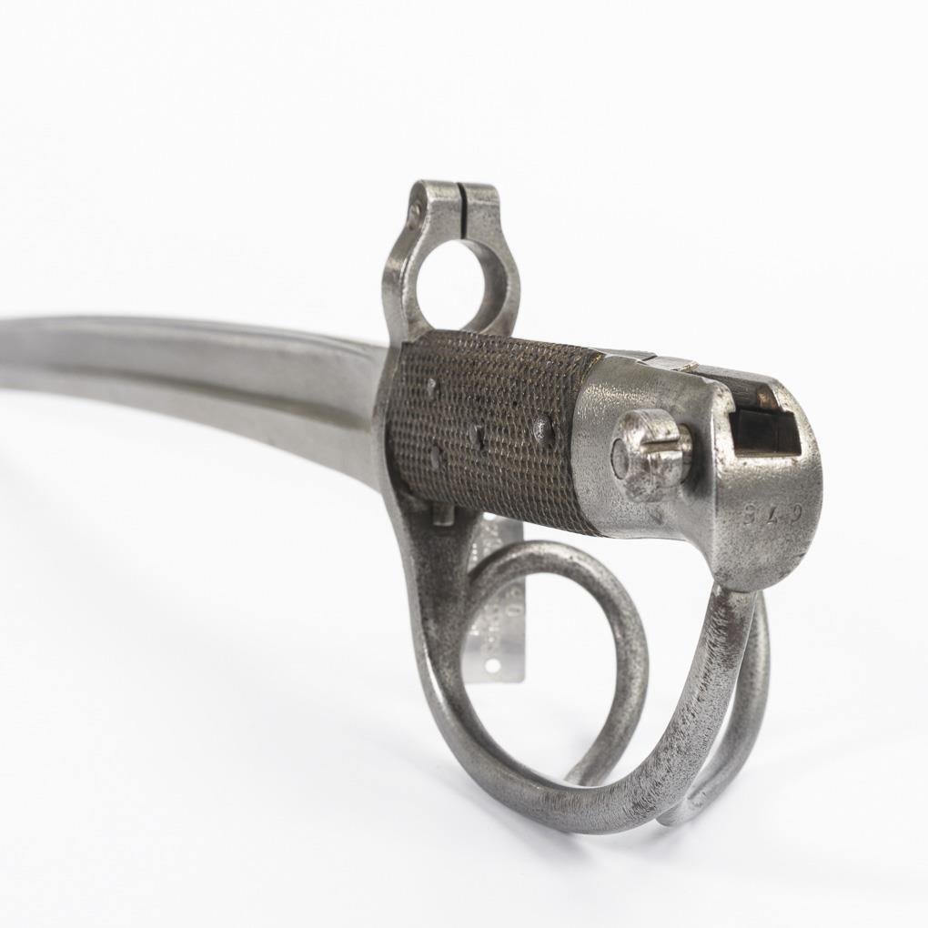 Aufpflanzbares Seitengewehr mit Jataganklinge, breiter Hohlschliff, zweischaliger Griff aus frühem Kunststoff mit Rautenmuster, dreispangiger Korb und Bajonettmechanismus. Lederscheide leicht berieben. Kugelspitze an der Scheide fehlt, leichte Gebrauchsspuren.