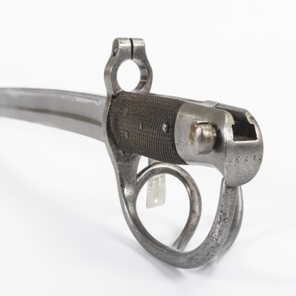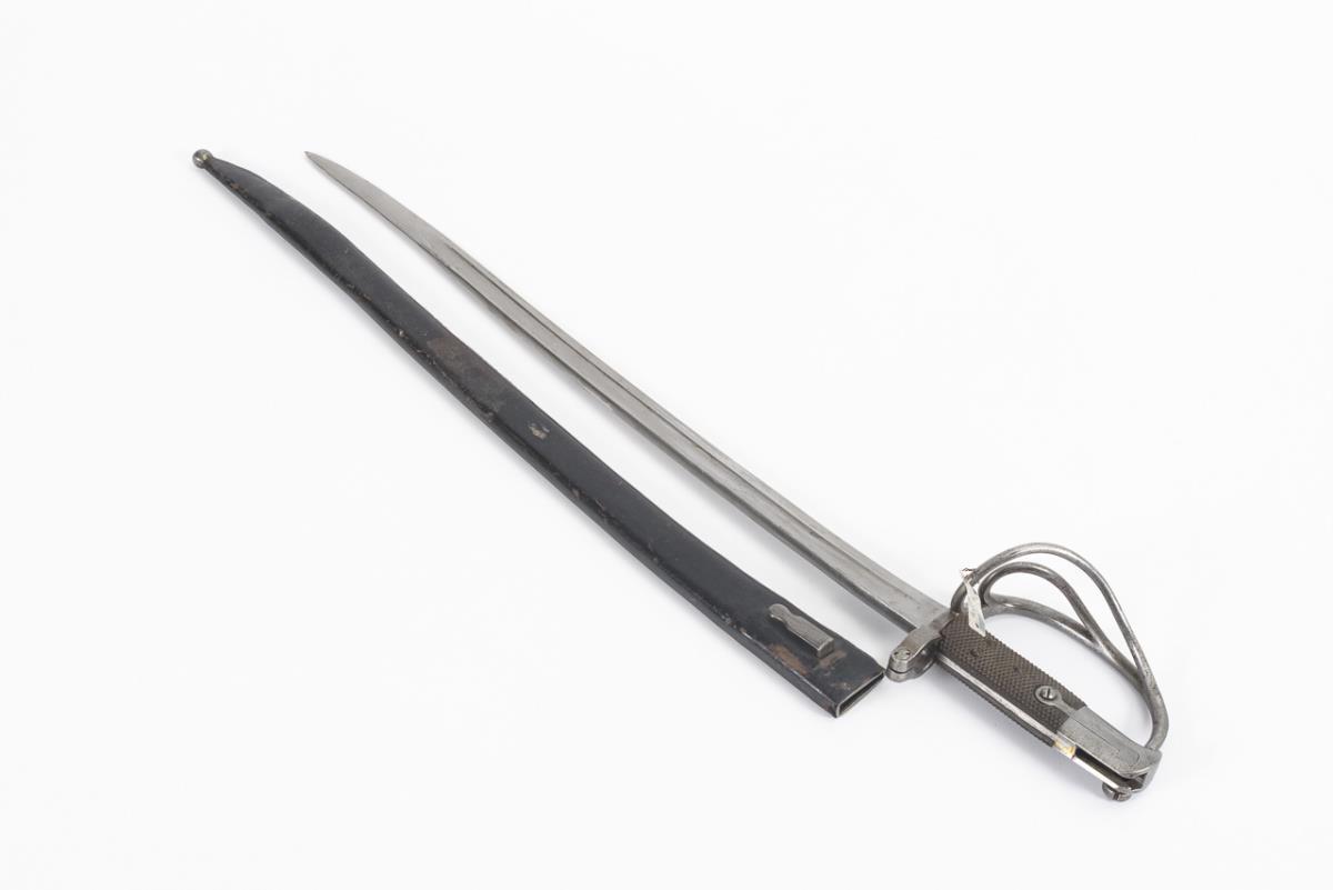 Aufpflanzbares Seitengewehr mit Jataganklinge, breiter Hohlschliff, zweischaliger Griff aus frühem Kunststoff mit Rautenmuster, dreispangiger Korb und Bajonettmechanismus. Lederscheide leicht berieben.