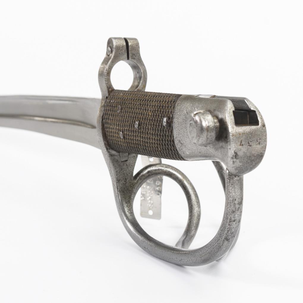 Aufpflanzbares Seitengewehr mit Jataganklinge, breiter Hohlschliff, zweischaliger Griff aus frühem Kunststoff mit Rautenmuster, dreispangiger Korb und Bajonettmechanismus. Lederscheide leicht berieben.
