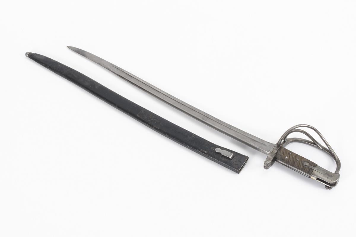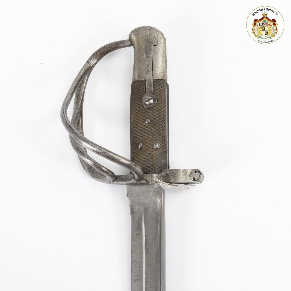 Aufpflanzbares Seitengewehr mit Jataganklinge, breiter Hohlschliff, zweischaliger Griff aus frühem Kunststoff mit Rautenmuster, dreispangiger Korb und Bajonettmechanismus. Lederscheide leicht berieben.