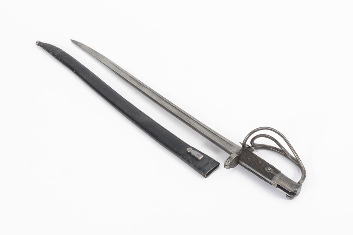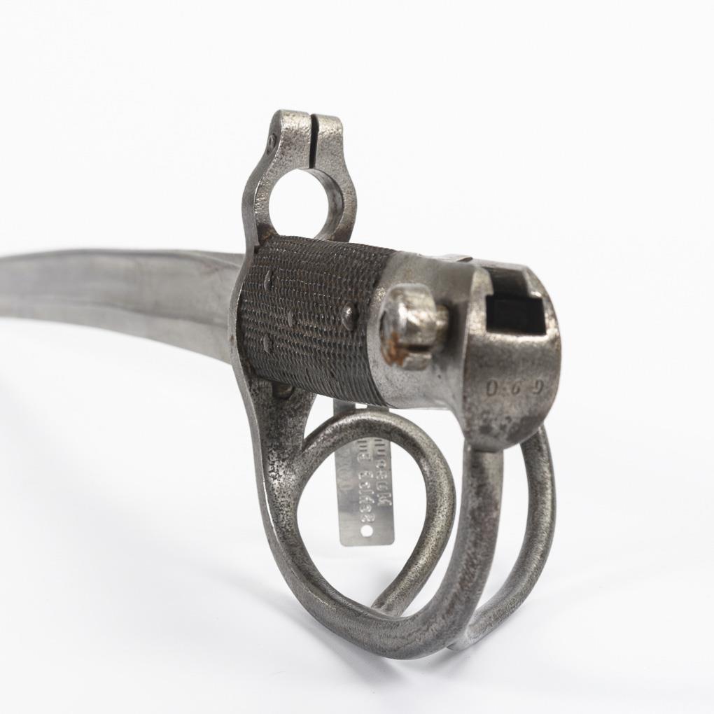 Aufpflanzbares Seitengewehr mit Jataganklinge, breiter Hohlschliff, zweischaliger Griff aus frühem Kunststoff mit Rautenmuster, dreispangiger Korb und Bajonettmechanismus. Lederscheide leicht berieben.
