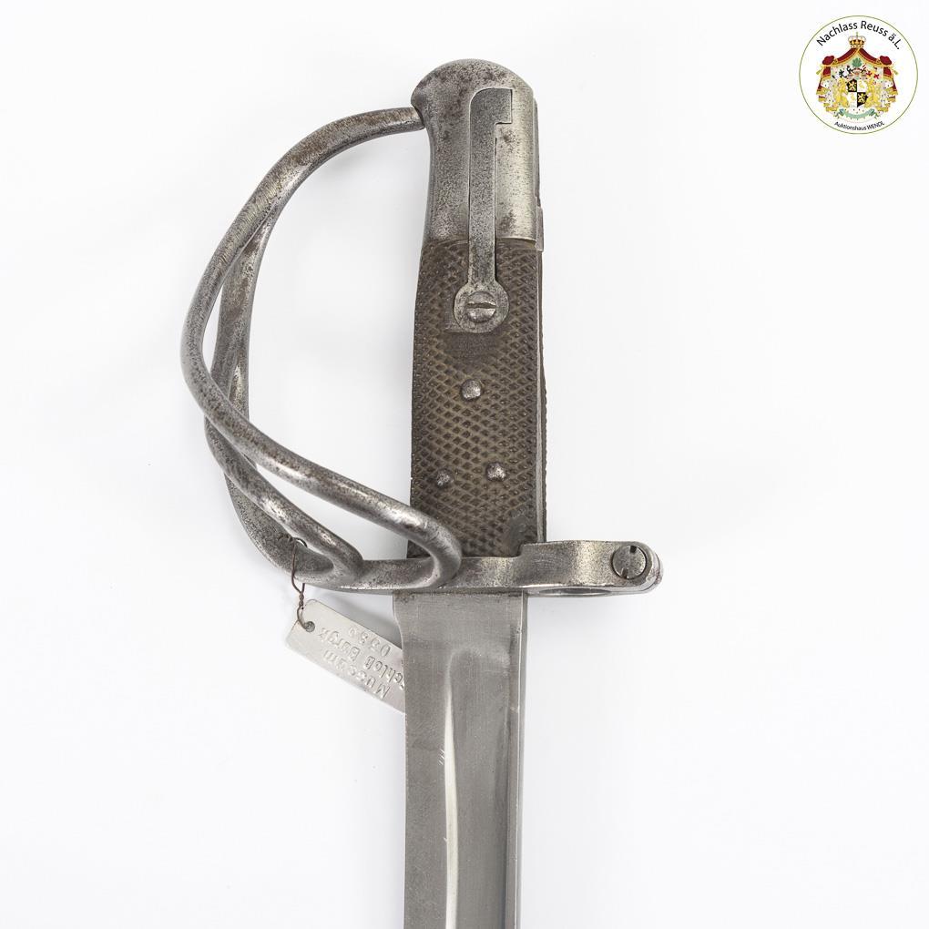 Aufpflanzbares Seitengewehr mit Jataganklinge, breiter Hohlschliff, zweischaliger Griff aus frühem Kunststoff mit Rautenmuster, dreispangiger Korb und Bajonettmechanismus. Lederscheide leicht berieben.