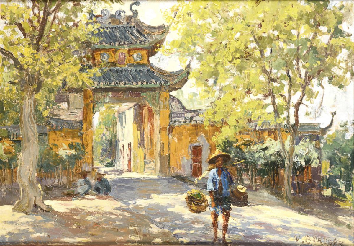 Bauer mit Körben im Sonnenschein vor dem Tor.