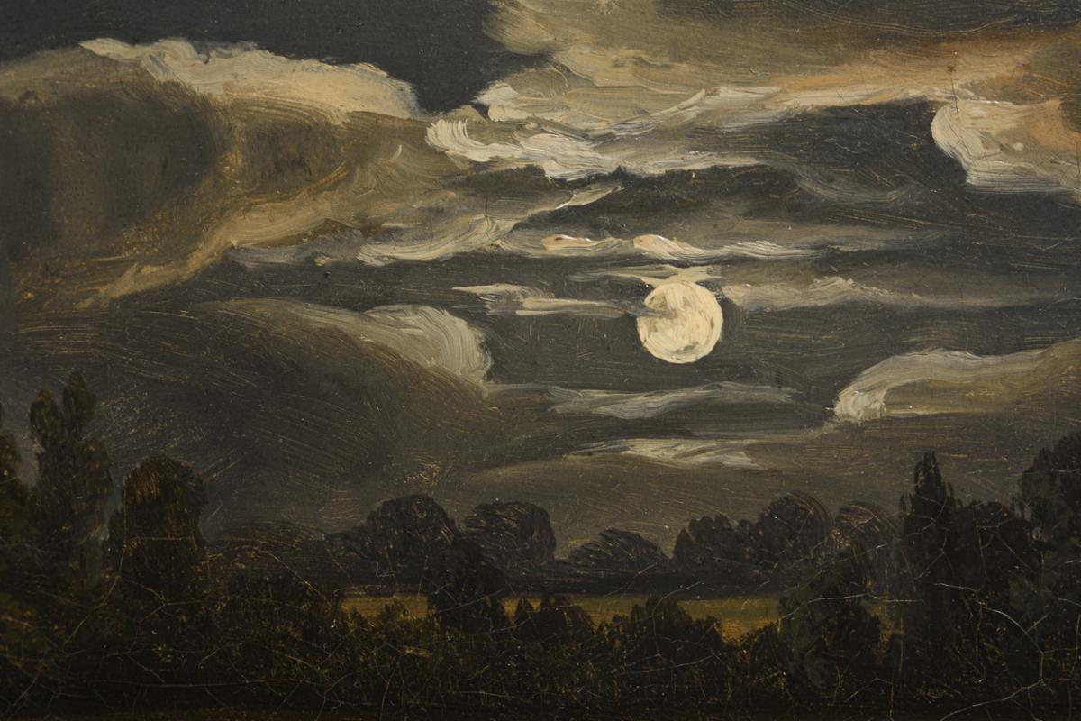 Staffagefiguren mit Boot am Ufer nahe einem Baumstumpf mit Blick in die weite, vom Mondlicht erleuchtete Landschaft. Altersspuren.