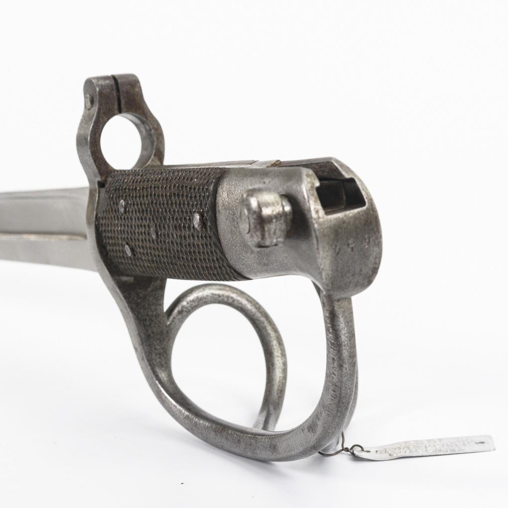 Aufpflanzbares Seitengewehr mit Jataganklinge, breiter Hohlschliff, zweischaliger Griff aus frühem Kunststoff mit Rautenmuster, dreispangiger Korb und Bajonettmechanismus. Ohne Scheide.
