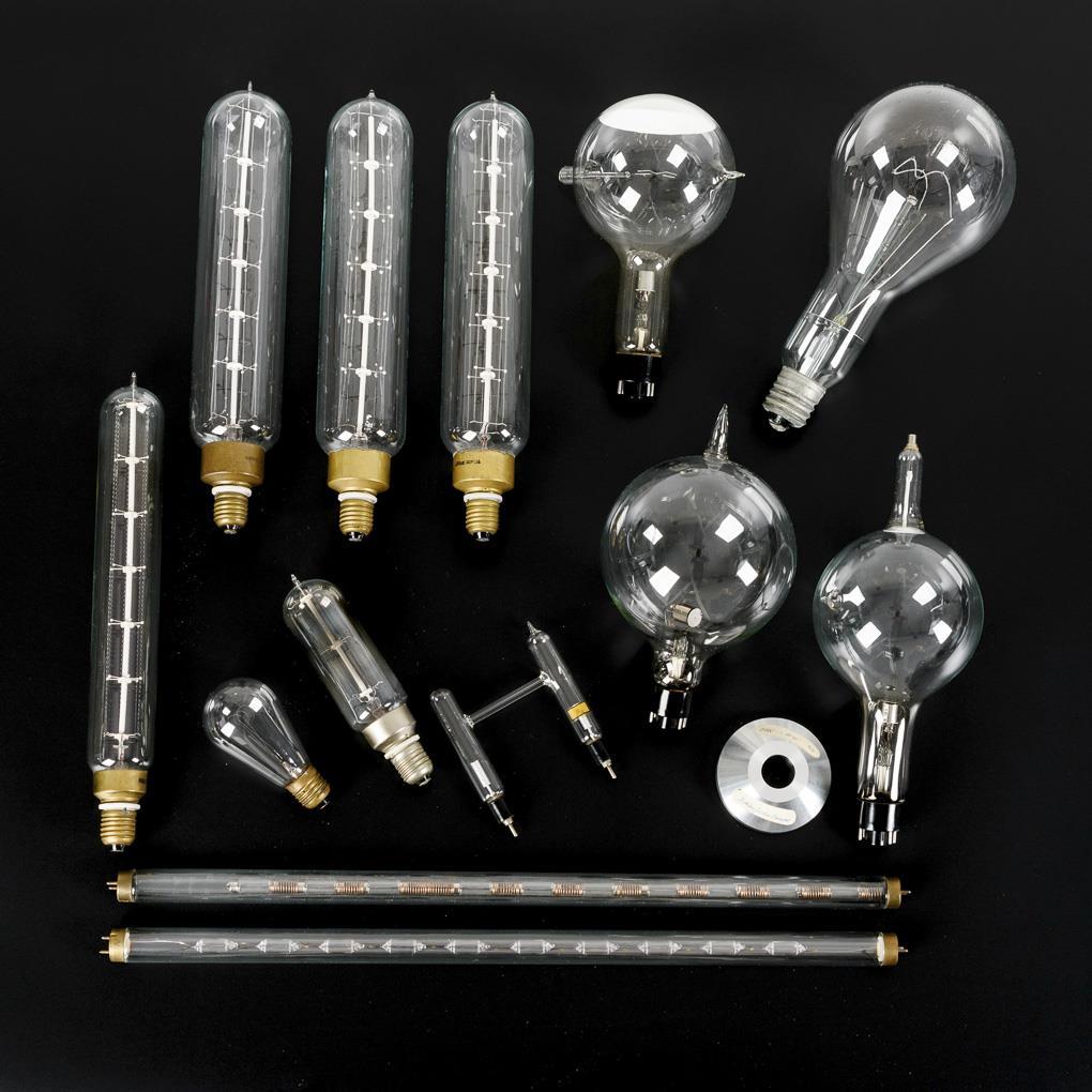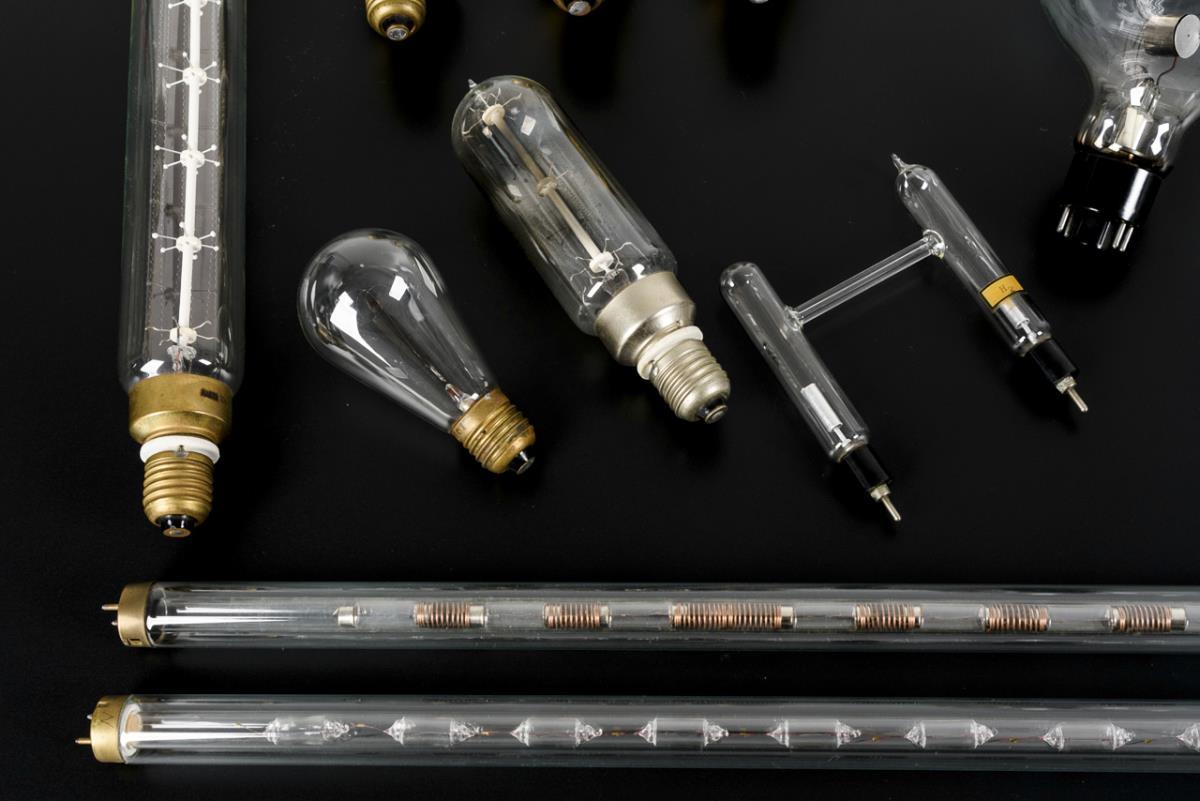 Verschiedene Lampen und Röhren, darunter 1 Kohlefadenlampe (wohl 1920er Jahre) mit neuer Halterung und Braunröhren. Dazu 4 Beizettel.