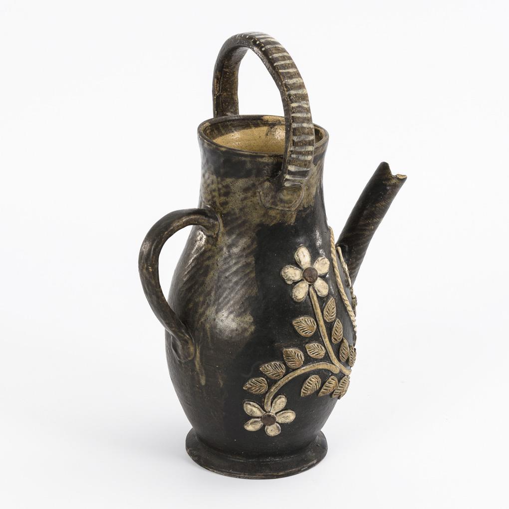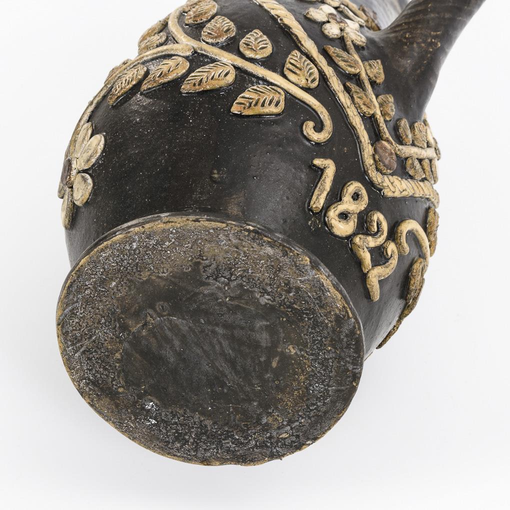 Irdengut, schwarz engobiert, geritzter Reliefdekor in Weiß, Braun und Grün. H 34,5 cm.