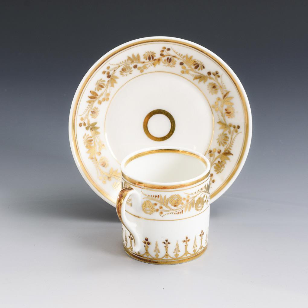 Zylindertasse mit Ohrenhenkel. Goldbemalt mit einem Blütenband am Rand und Ornamentzier am Stand. Chip am Tassenstand.