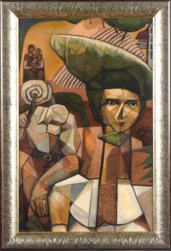An den Kubismus erinnernde Szene mit einer Frau, einem Lastenträger sowie einer Familie in abstrakter Landschaft.