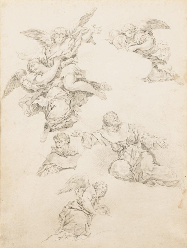 Fein gezeichnete Studie mit Engeln und Geistlichem in dekorativem Rahmen mit Volutenbekrönung. Randbereich stockfleckig, knickspurig.