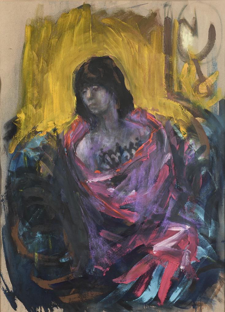 In eine Decke gehüllte, sitzende junge Frau. Leichte Knicke an den Rändern.