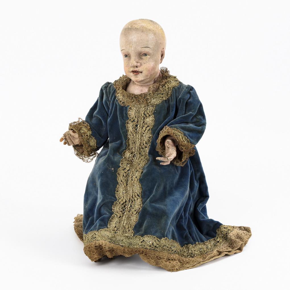 "Trösterlein", "Himmlischer Bräutigam", "Bornkinnel" oder Prozessionsfigur des aufrecht sitzenden Jesuskindes mit beweglichem Ellenbogen. 5 Finger und 1 Zeh fehlen, 1 Finger und 1 Leimfuge geklebt, Trockenrisse zumeist unterm Mantel, geringe Ausbrüche am Gelenk, Fassung übergangen, Alters-/Gebrauchsspuren.
