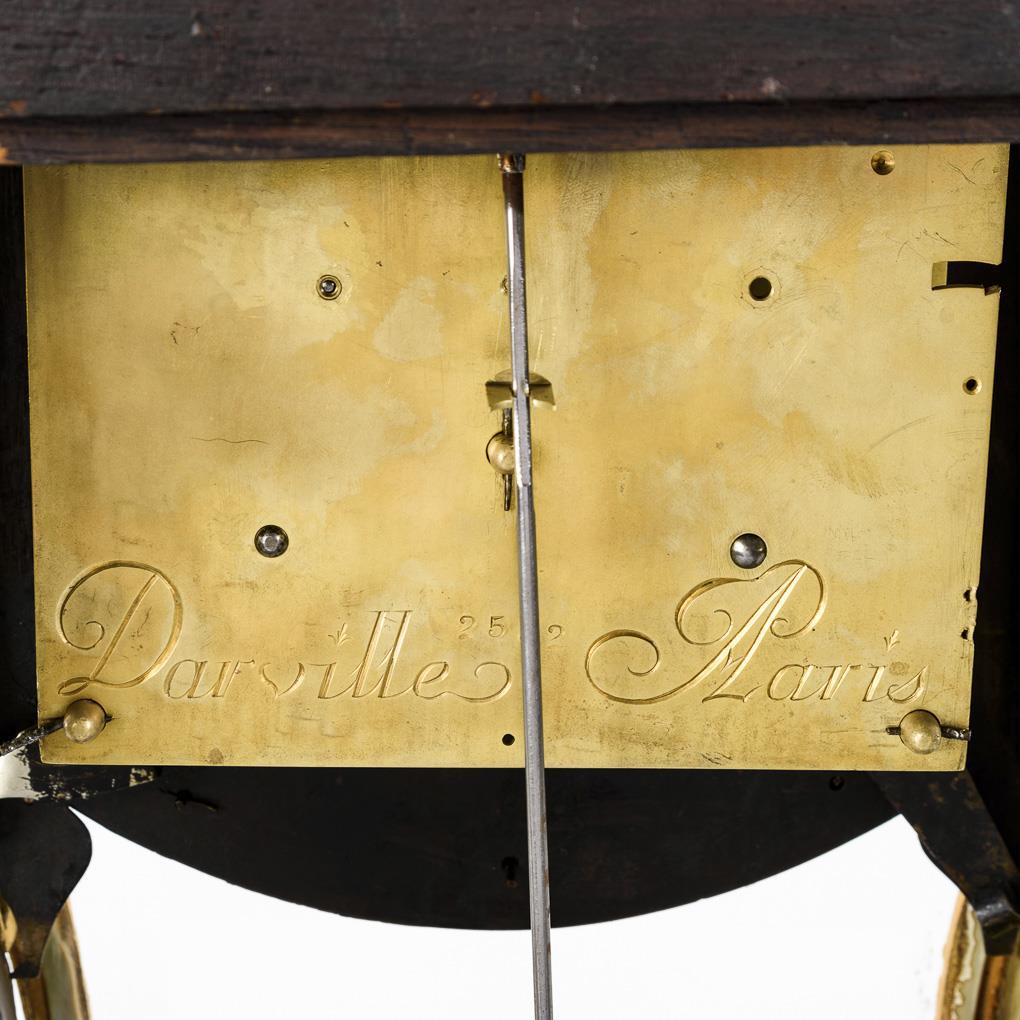 "Darville à Paris 2552" graviertes Vollplatinenwerk, Schlagwerk (Halbstundenschlag) fehlt, Gehwerk läuft (revisionsbedürftig). Weißes Emailzifferblatt mit römischen Stunden und arabischen Minuten, Minutenkranz und Eisenzeigern, bezeichnet "Darville à Paris".