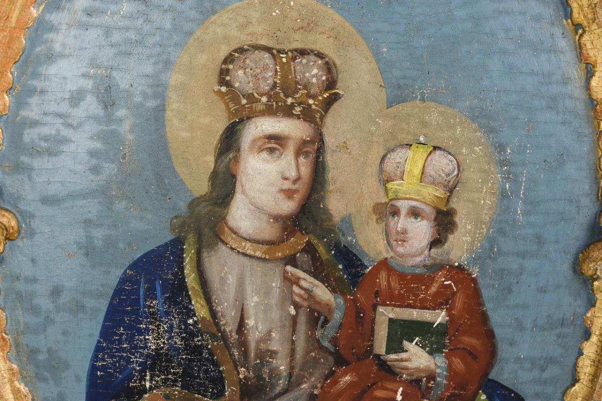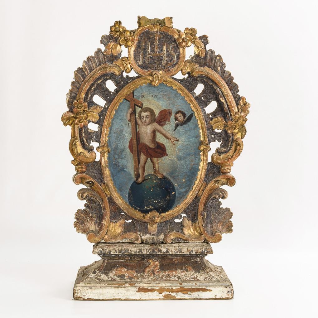 Konischer Sockel mit Rocaillenreliefs in den Kassettierungen. Stehende Kartuschentafel mit 2 Schauseiten, Rocaillen-Rahmungen sowie bekrönenden Kartuschen mit Monogrammen. Beidseitig bemalt: Madonna mit bekleidetem Jesuskind unter Marienmonogramm bzw. Jesuskind mit Kreuz auf der Weltkugel unter IHS. Fehlteile an der Bekrönung, starke Alters-/Gebrauchsspuren.