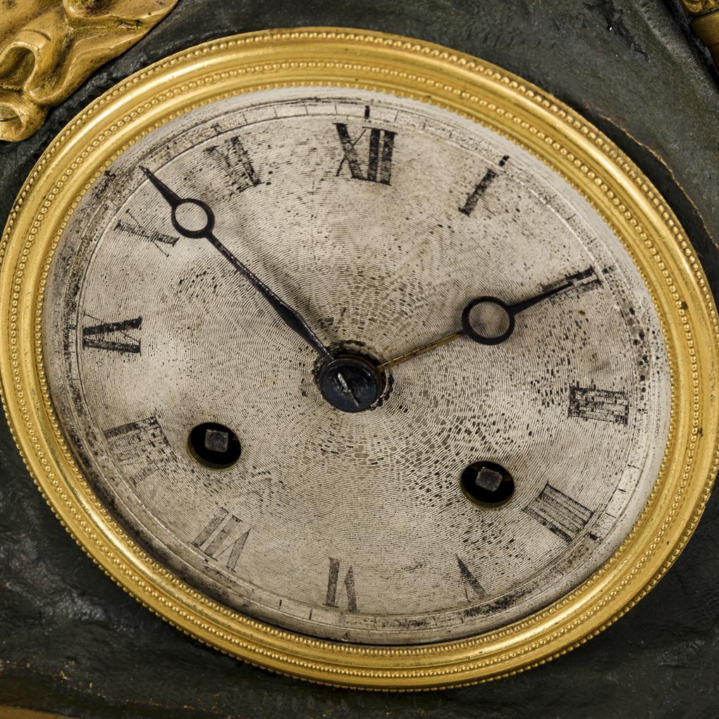 Hoher, profilierter Stufensockel mit bekrönender weiblicher Plastik in antikisierendem Gewand, seitlich ein Köcher mit Pfeilen, weitere Attribute fehlen. Leichte Alters- und Gebrauchsspuren, Zifferblatt berieben.