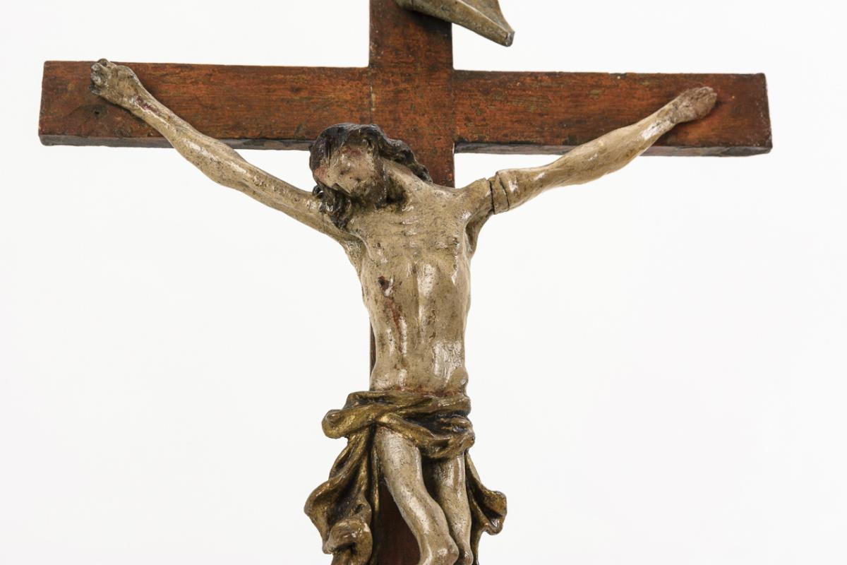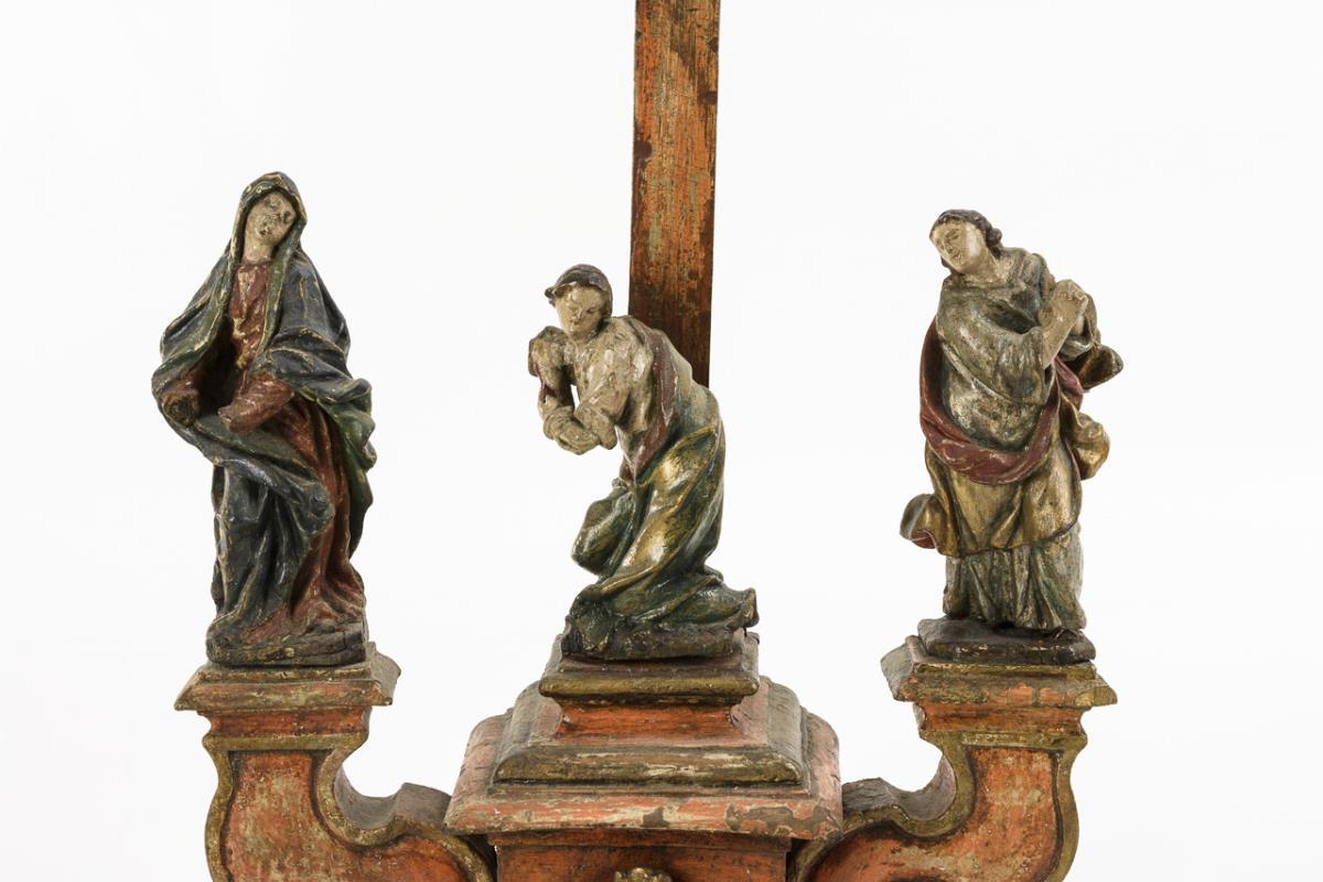 Auf dem Postament die vollplastischen Figuren von Maria, Johannes und Maria Magdalena sowie darüber der Corpus Christi am Kreuz. Fehlteile, 1 Sockelfuß ergänzt, Fassung übergangen, Alters-/Gebrauchsspuren.