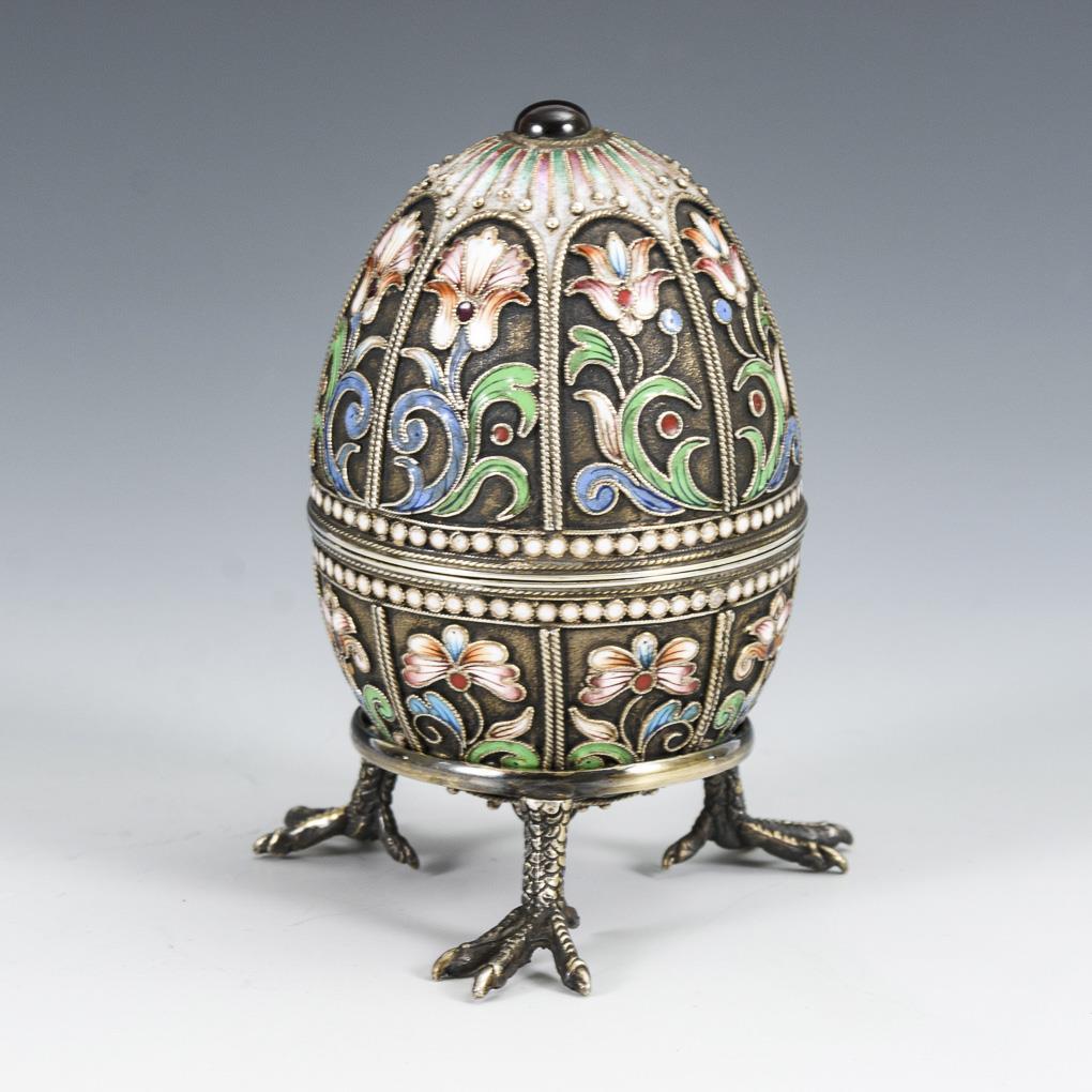Floral emailliertes Ei, auf Ständer mit 3 Krallenfüßen. Am Unterteil einige feine Haarrisse im Email.