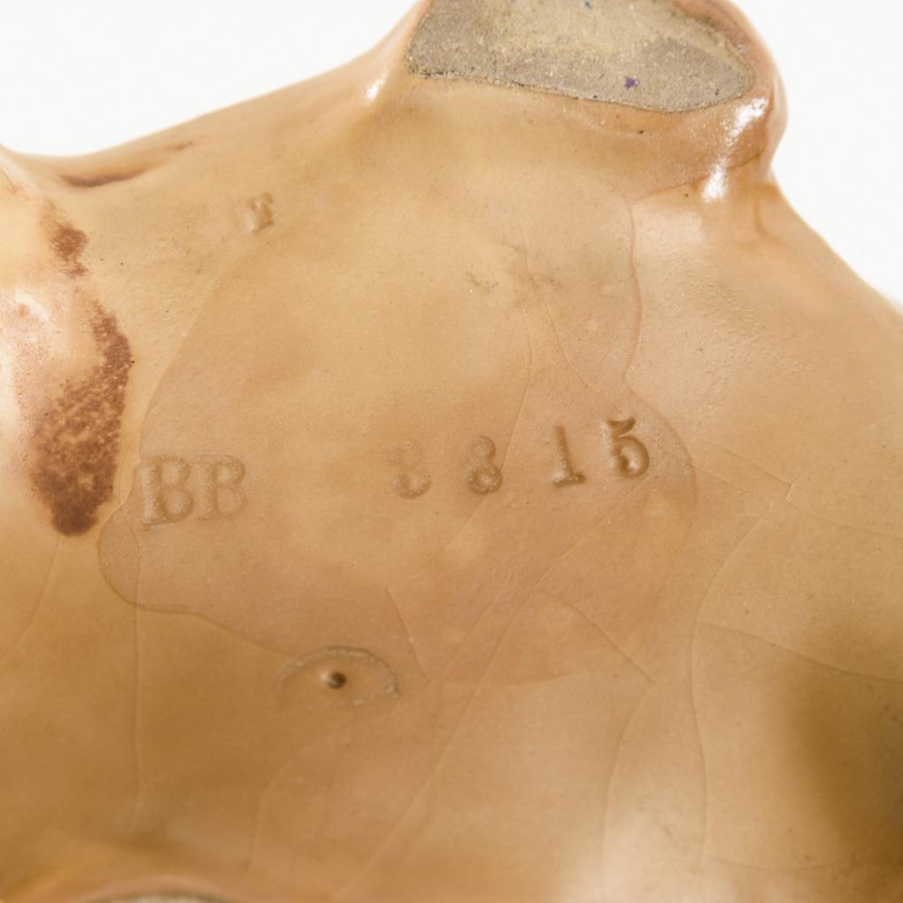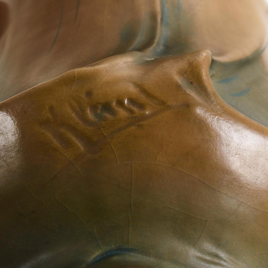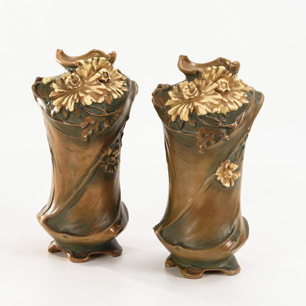 Pressmarke "BB", vor 1887 - nach 1913. Wandung signiert "Klimt". Entwurf: Carl KLIMT (1876-1945), von ca. 1895/1900 bis 1930 künstlerischer Mitarbeiter bei Bernhard Bloch, um die Jahrhundertwende Entwürfe für vorwiegend Gefäße und Figuren, teils stilistische Anlehnung an die Arbeiten von Michael Powolny, ab ca. 1911 auch Ausführung von Entwürfen der Wiener Werkstätte. Modell-Nr. 3815. Steinzeug, matt braun und grün glasiert. H 33 cm. Zylindrisches Vasenpaar mit blütenreliefierter Wandung im typischen floralen Jugendstil. 1 Vase mit leichten Bestoßungen am Fuß.