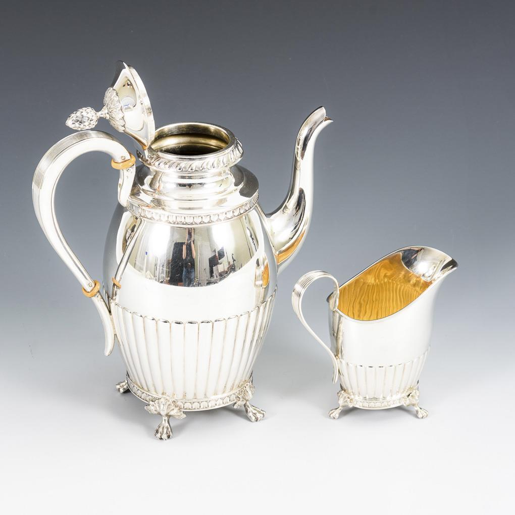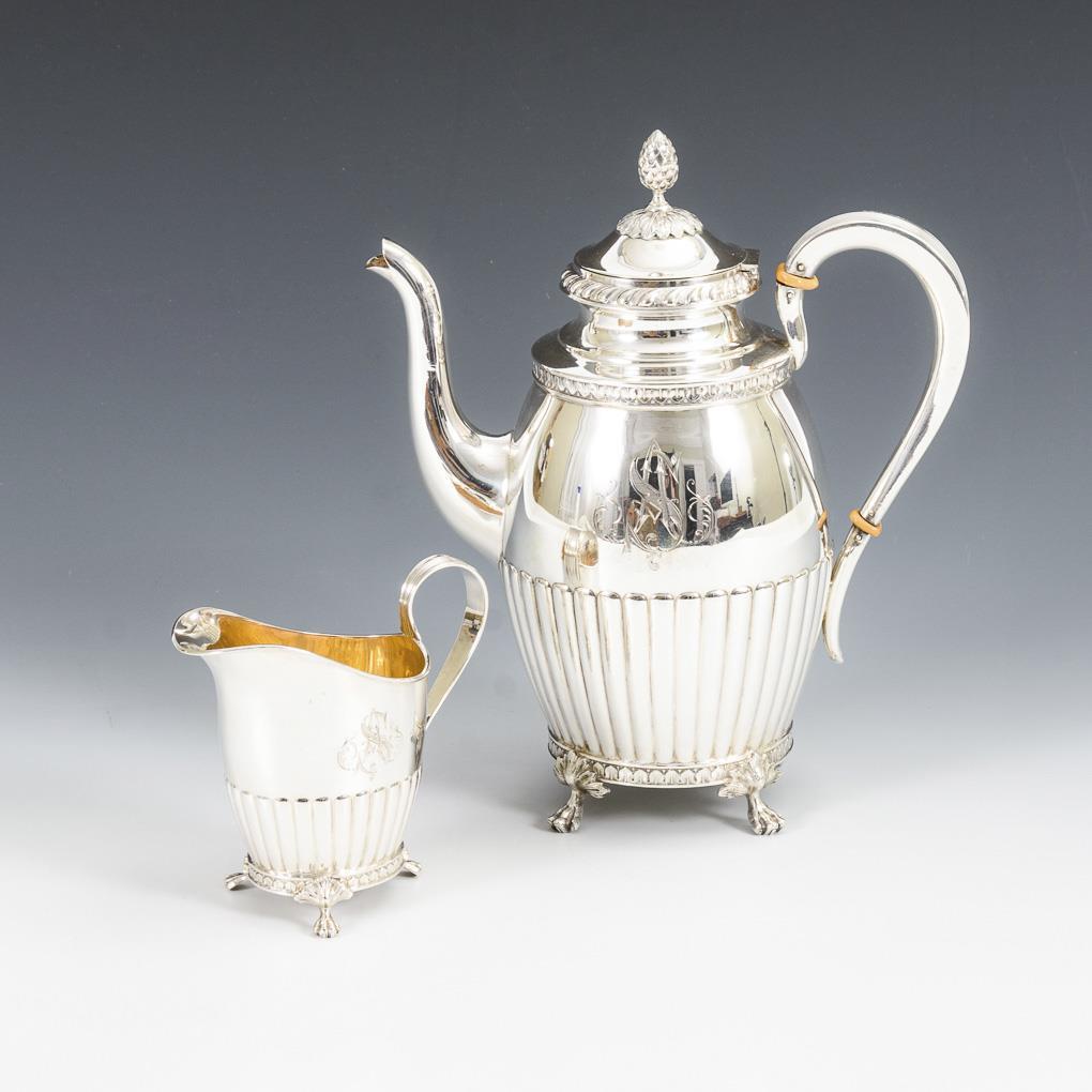 Teilgerippter Korpus mit Zungenband und Tatzenfüßen. Kaffeekanne mit Zapfenknauf, Kännchen innen vergoldet. Beide mit verschlungener Monogrammgravur "AS".