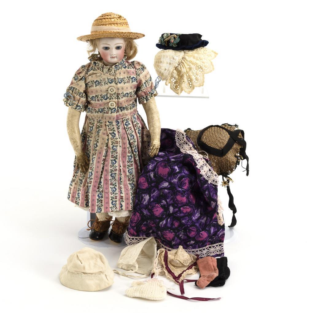 Kurbelkopf auf Brustplatte, feste blaue Augen, Ohrringe, blonde Mohairperücke. Schlanker Lederkörper mit Po-Zwickel und einzeln genähten Fingern. Rosa gemustertes Kleid, Wachstuchschuhe, Strohhut. Als Zugabe Kleid, 2 Hüte, 2 Hauben etc. Brustplatte an der rechten Schulter gebrochen, kleine Restaurierung am linken Auge.