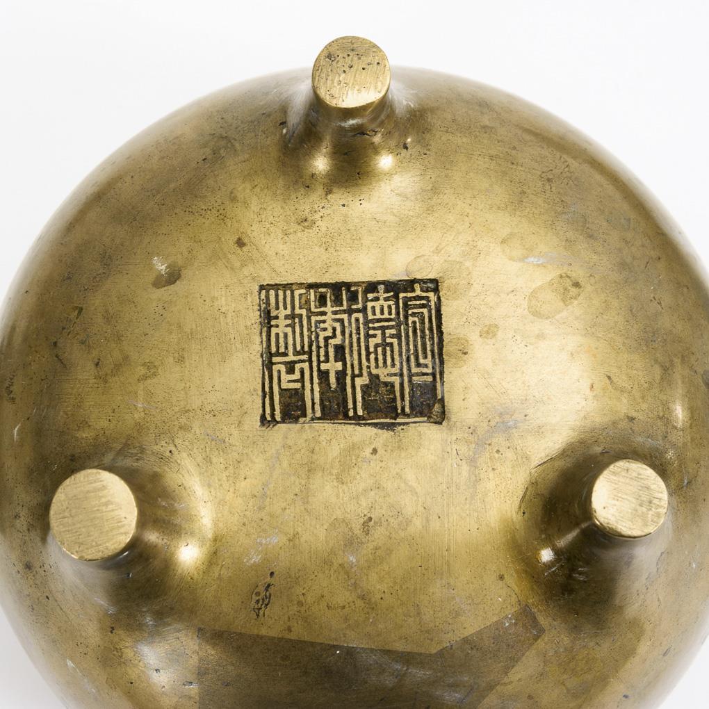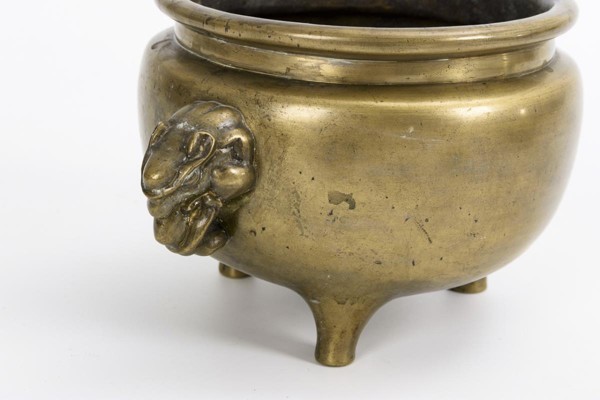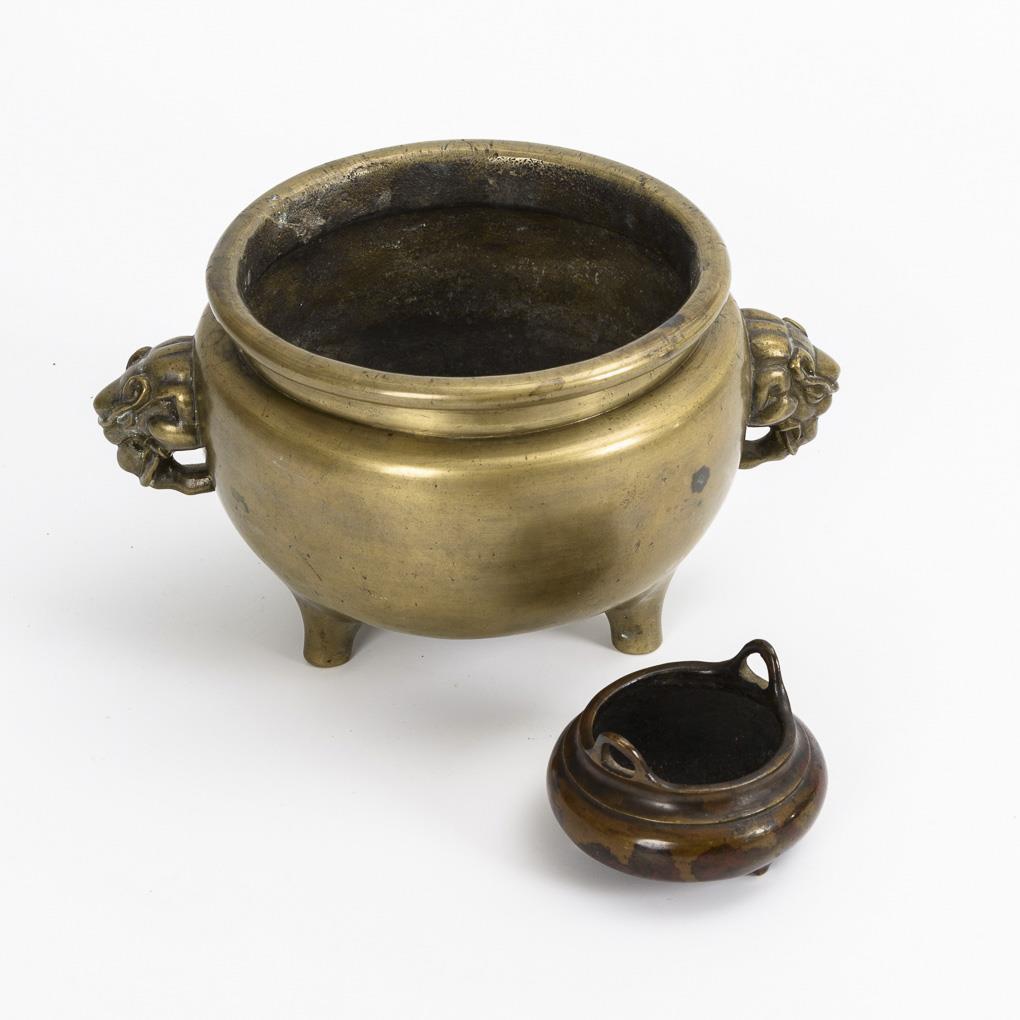Größerer, dreibeiniger Messingkorpus mit zwei Elefantenhandhaben. Alte professionelle Reparaturstellen. / Kleines Gefäß mit zwei Henkeln, eventuell: Xuantong (1909 - 1911).
