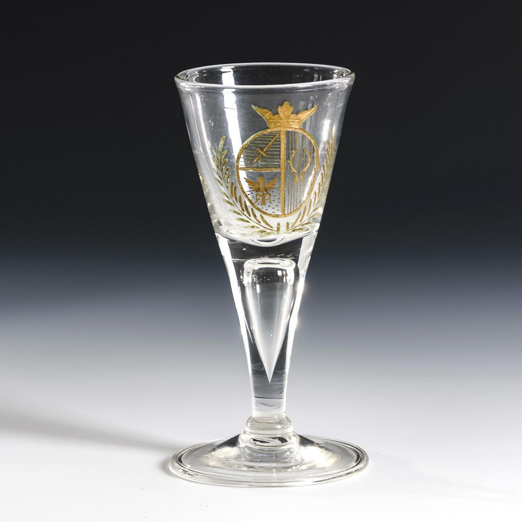 Spitzkelch mit eingestochener Luftblase am Kuppaboden, große tropfenförmige Luftblase im Schaft, Rundfuß mit umgeschlagenem Rand, Abriss. Schauseitig ein graviertes und goldstaffiertes Wappenschild mit Schwert, Geweih und Adler.