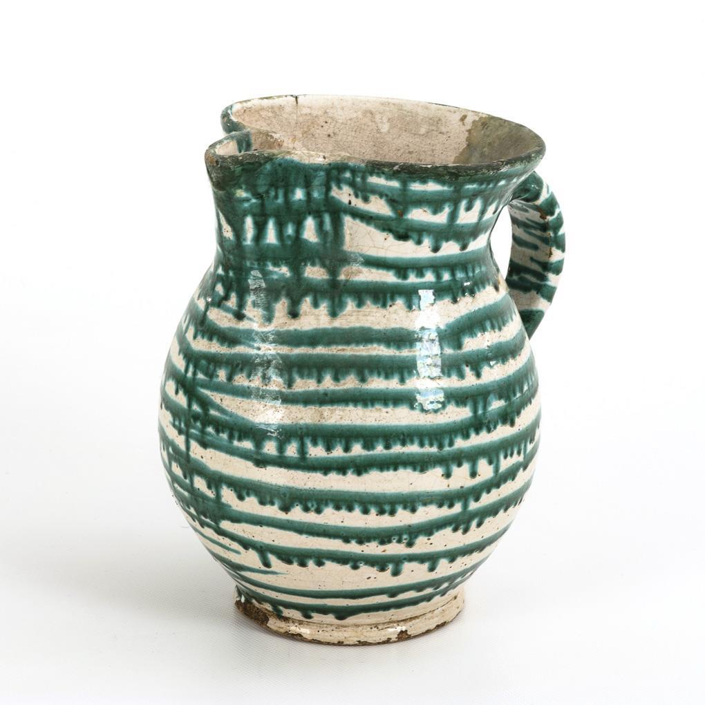 Rötlicher Scherben, weiß glasiert, grün geflammt. H 25 cm.