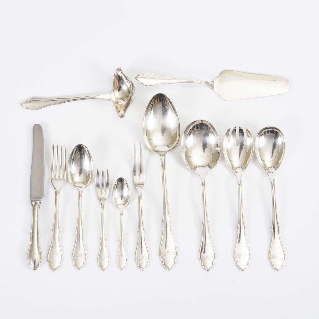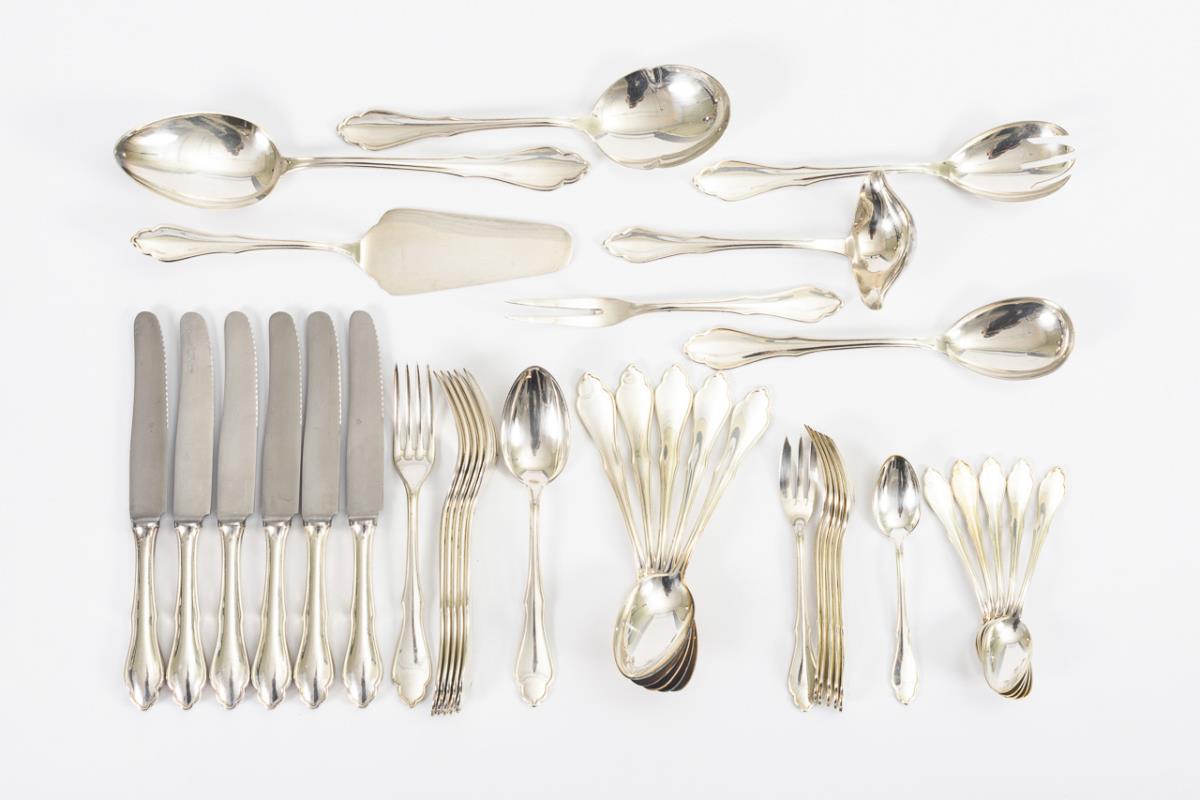 6-Personen-Silberbesteck mit Vorlegeteilen. Besteckfabrik Gürtler, Düsseldorf.