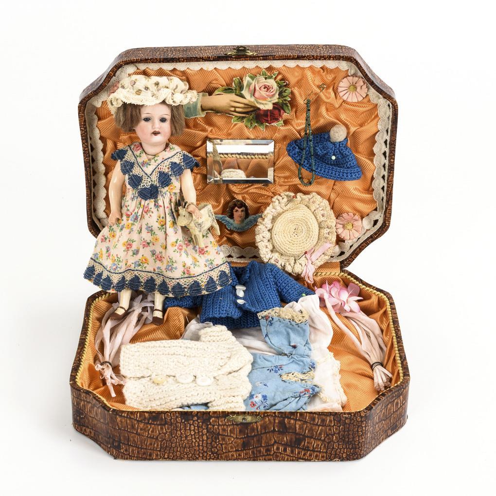 Kleine Mädchenpuppe mit Kleidung und Zubehör in Kästchen. Armand Marseille.