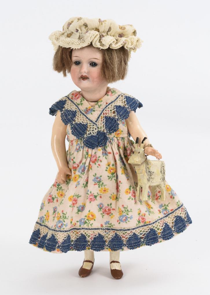 Püppchen mit Kurbelkopf, blauen Schlafaugen, dunkelblonder Mohairperücke und Stehpuppenkörper, in geblümtem Kleidchen. Dazu 6 Teile Kleidung in 8-eckiger Schatulle in Kroko-Optik. Körper partiell übermalt.