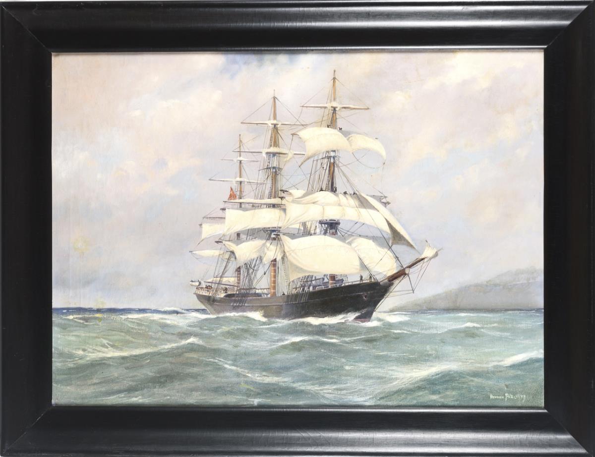 Das Schiff im Sonnenschein nahe einer Küste. Altersspuren.
