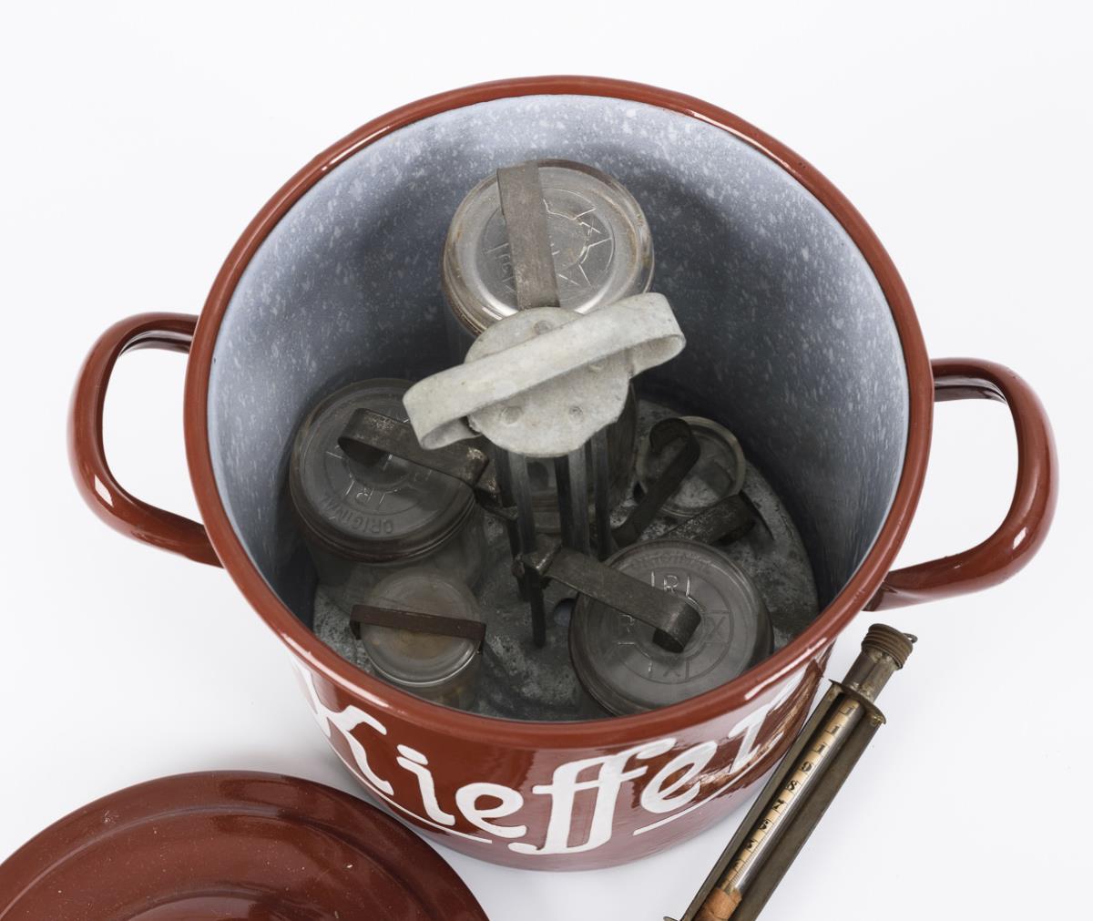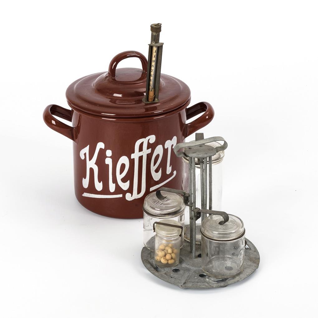 Topf mit Einsatz, Thermometer und 3 Gläsern. Leichte Altersspuren.