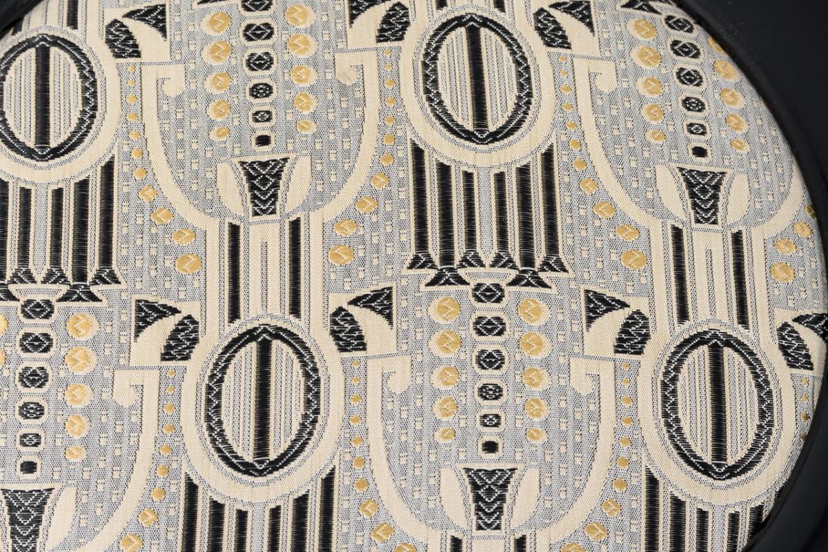 Höhenverstellbare, runde Sitzfläche auf geschwungenem Dreibein. Ergänzter heller Stoffbezug mit schwarz-goldener Ornamentik. Restauriert.
