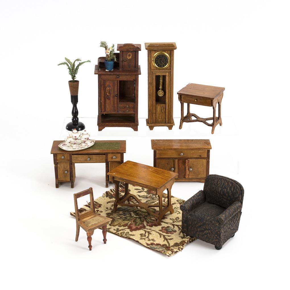 Vertiko, Halbschrank, Schreibtisch, Nähtisch, Tisch, Stuhl, Standuhr, Sessel, Palme und Miniatur-Dejeuner. Dazu Webteppich. Leichte Altersspuren und kleine Farbflecke.