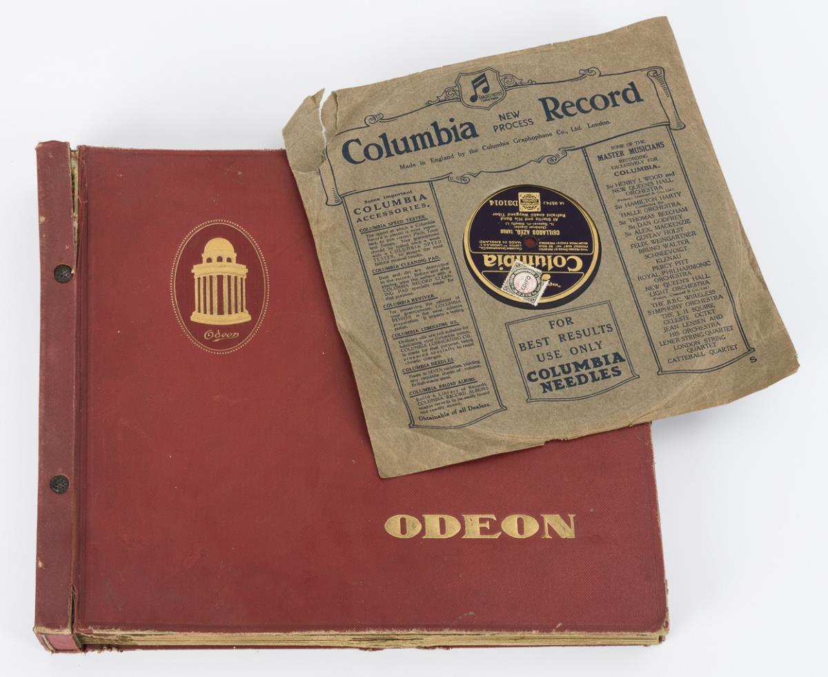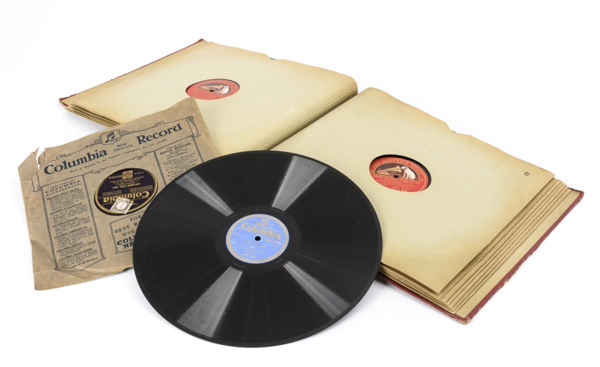 Quaderförmiger, schlichter 4-türiger Schrank auf 4 Pfeilerbeinen mit integriertem Grammophon unter Scharnier-Klappdeckel, 2 Türen für Schallöffnung mit integriertem Trichter, darunter 2-türiges Plattenfach mit Sammlung von 10 "Odeon"-Schellackplatten in originaler Mappe; Tonarm mit gemarkter Schalldose "Homocord", Ersatznadeln, Plattenteller, Geschwindigkeitsregler und Bremse, seitliche Kurbel. Gehäuse wohnfertig restauriert.