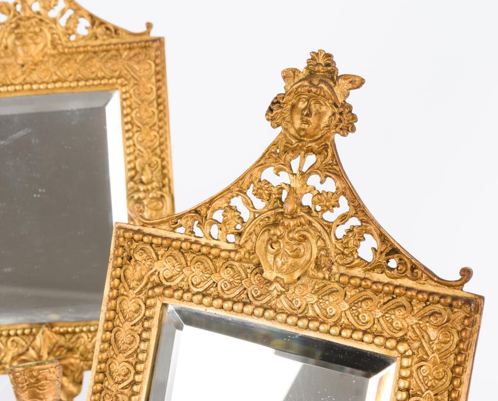 Reich reliefierte Rahmen mit facettiertem Spiegel, Hermeskopf als Bekrönung sowie Blattmaske mit den Armen für die 2 Kerzentüllen. Etwas angelaufen, Reste von Klebestreifen.