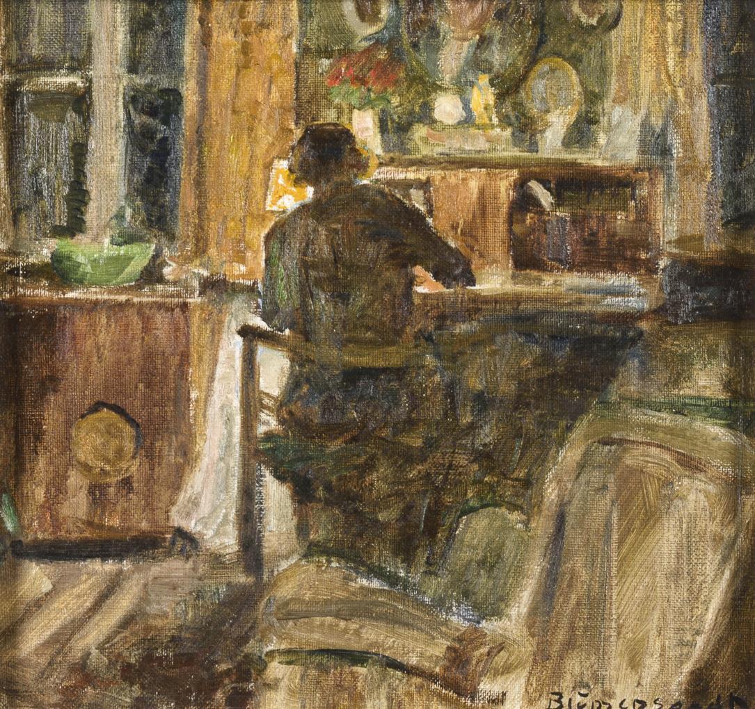 Interieur mit männlicher Rückenfigur an einem Schreibtisch.